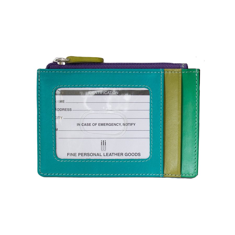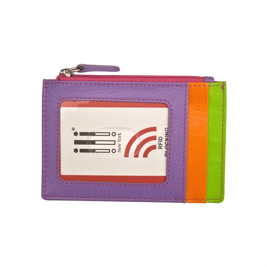 Leather credit card holder with RFID blocking lining. Exterior- side zip pocket, ID window and credit card slot on front, two credit card slots on the back.
