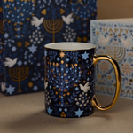 Illustrated doves, laurels, and glowing candles decorate this porcelain Hanukkah mug, accented by a polished gold handle and rim.