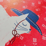 Yeehaw! Get your strut on with this charming cat wearing cowboy boots and a matching hat. Risograph printed in bright red and federal blue.