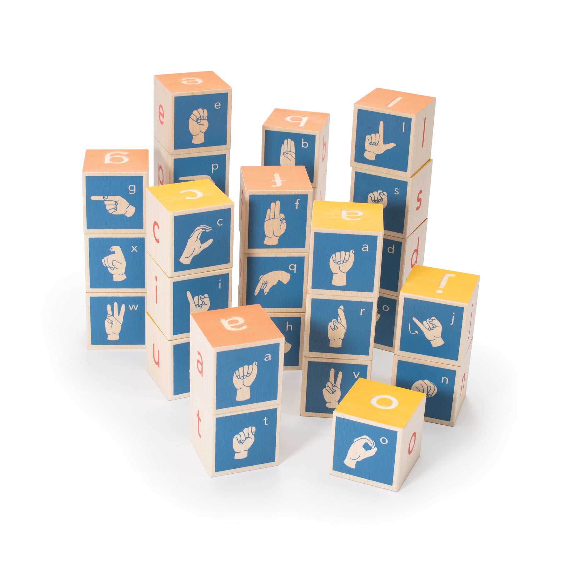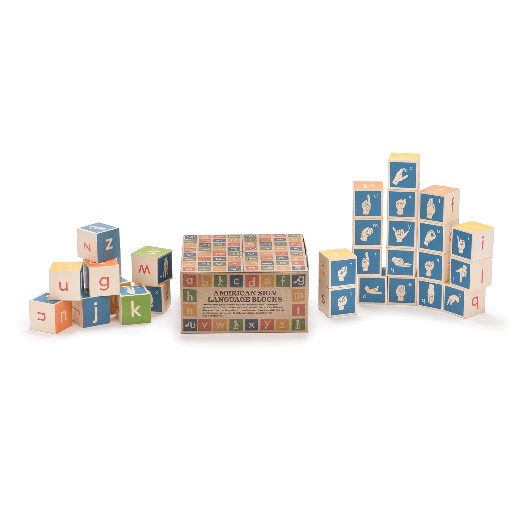 An educational toy for those who want to use American Sign Language to communicate. Touch the two debossed sides on every block of this 28 block set. Use your fingertips to trace the clean, European-style font that accompanies every letter. Feel the attention to detail in every hand crafted cube. This set features our Classic Uncle Goose color palette.