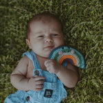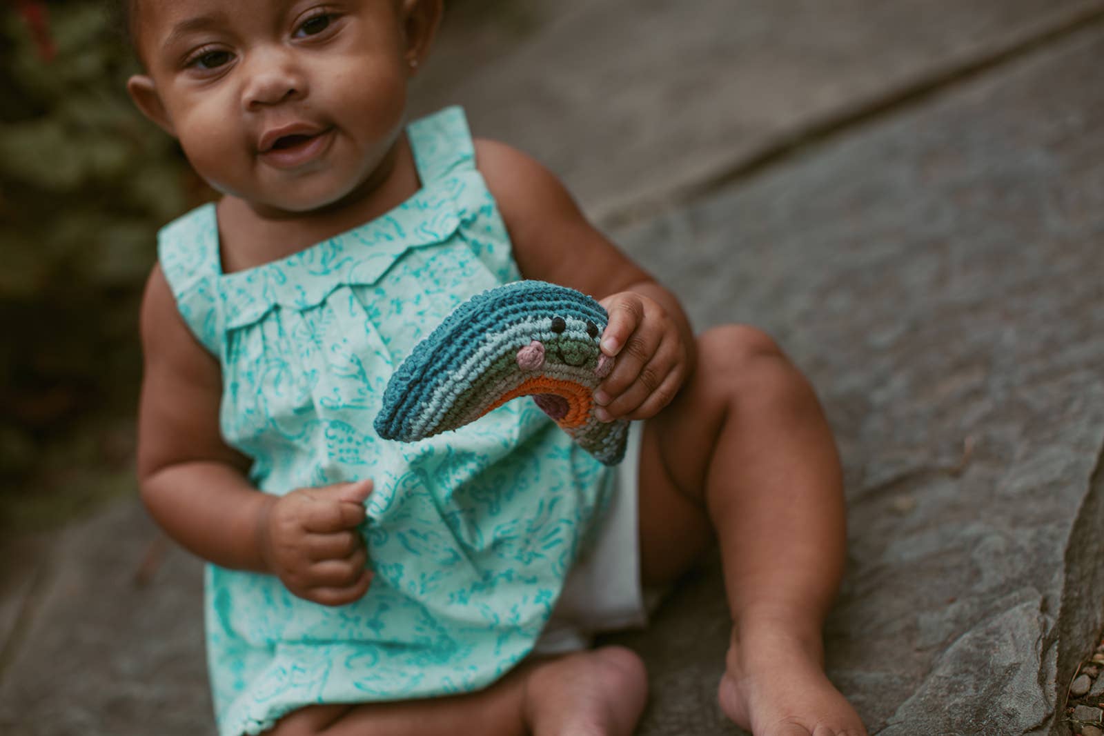 Brighten baby’s day with our Friendly Weather Rainbow Rattle in muted colors!