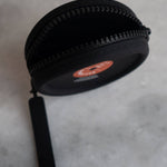 Super nifty round zipper pouch made of food grade silicone with a satisfyingly chunky plastic zipper and coordinating wrist strap.