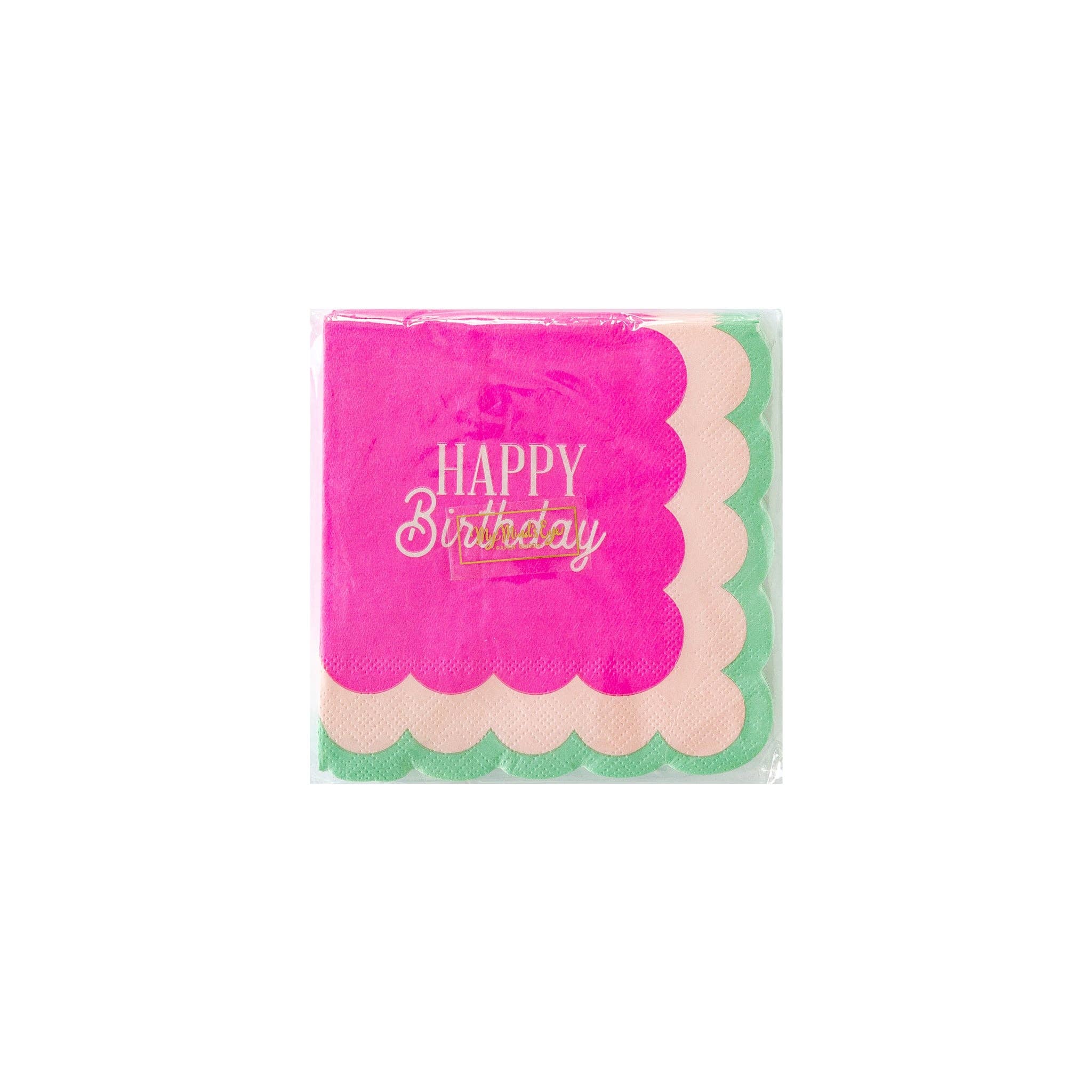 Set a cheerful party table with these perfectly pink scalloped napkins. With a simple birthday message, these happy birthday napkins help make the table the center of the party. From princess tea parties to birthday cocktails with the girls, you can't go wrong with these tone on tone pink napkins • Includes 24 scallop edged napkins