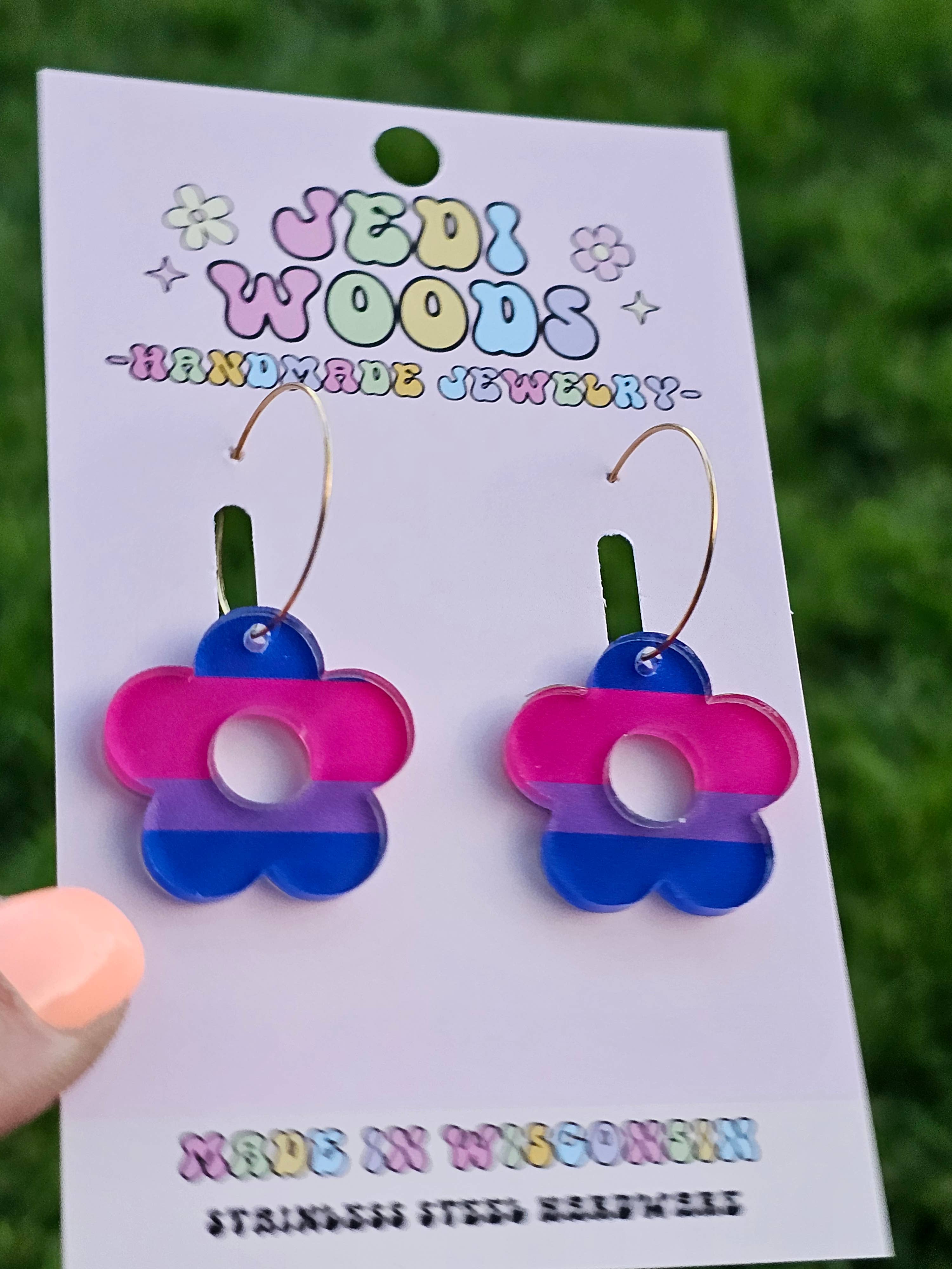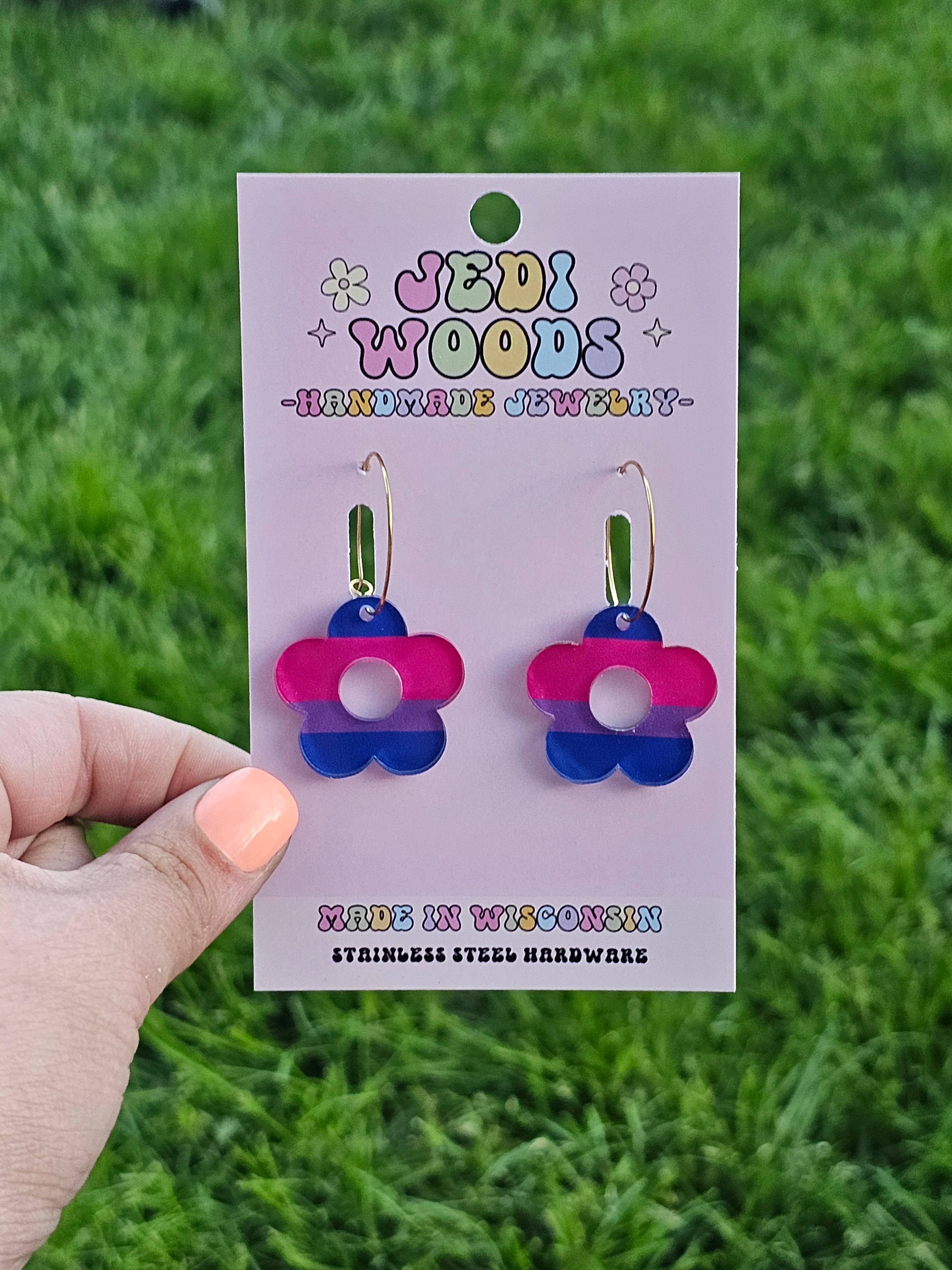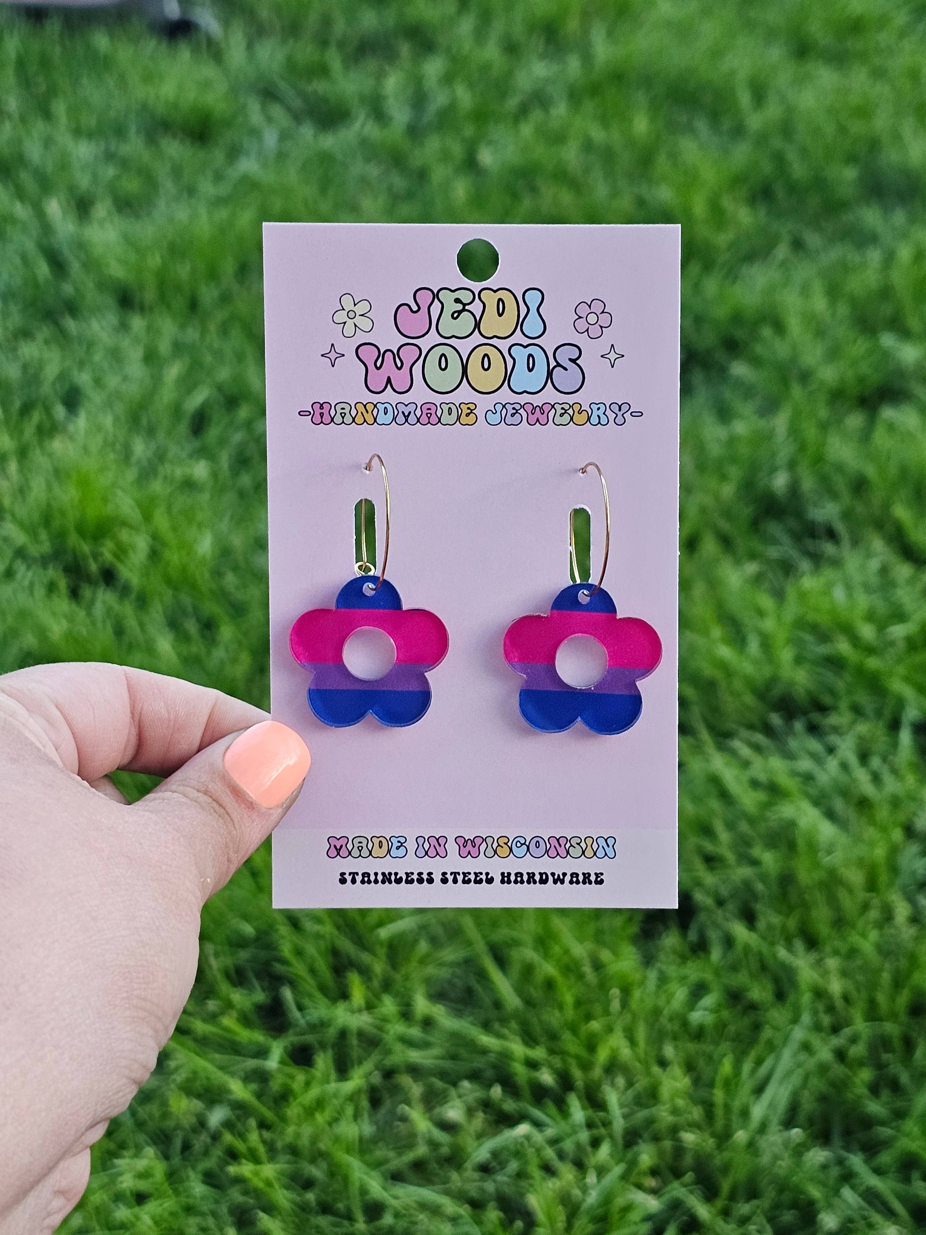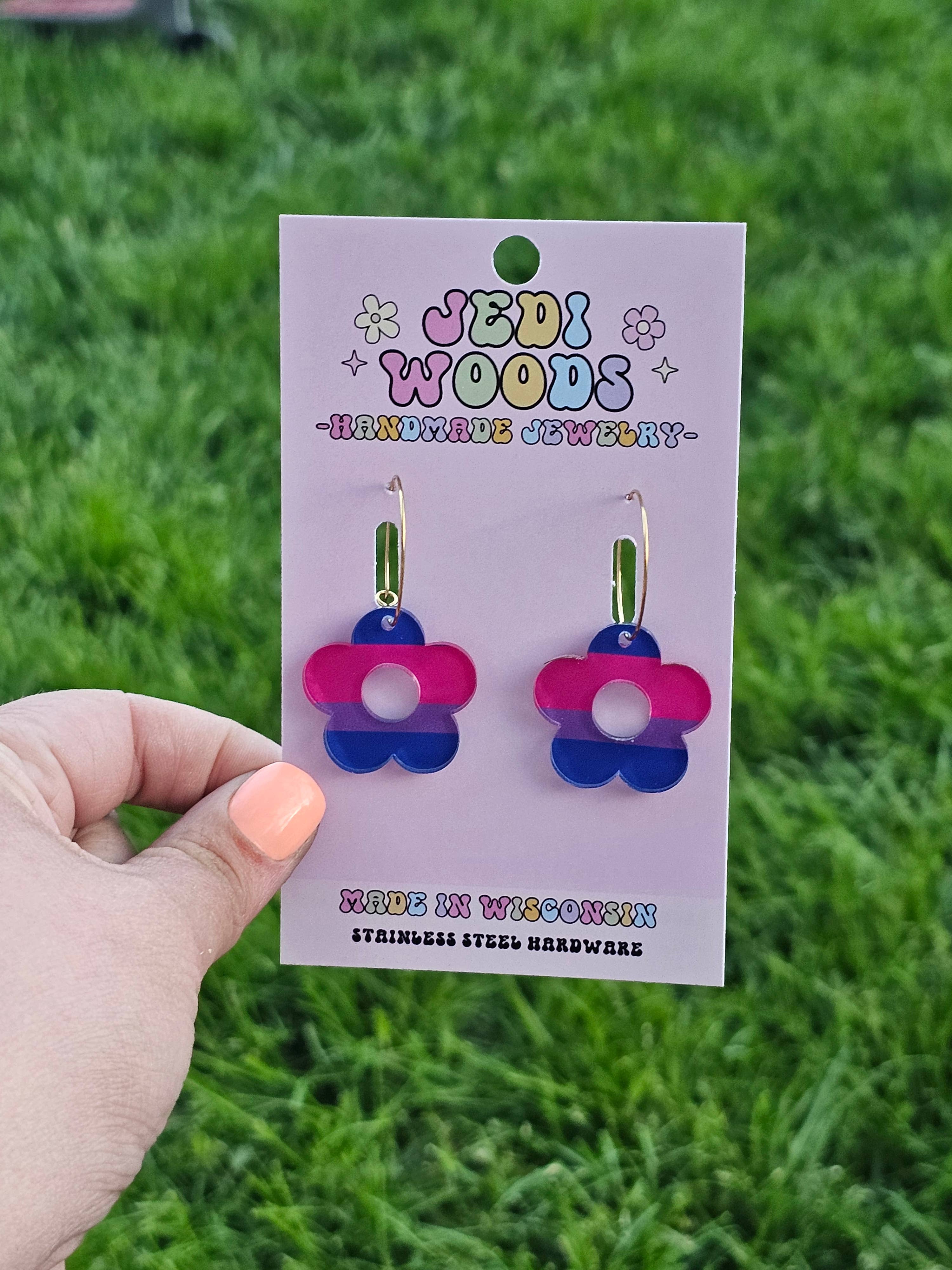 Celebrate Pride with the unique collection of Pride flag florals. The Bisexual Pride flag is uniquely discreet in a cute flower shape and accompanied by gold coated stainless steel hoops.