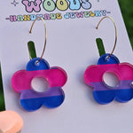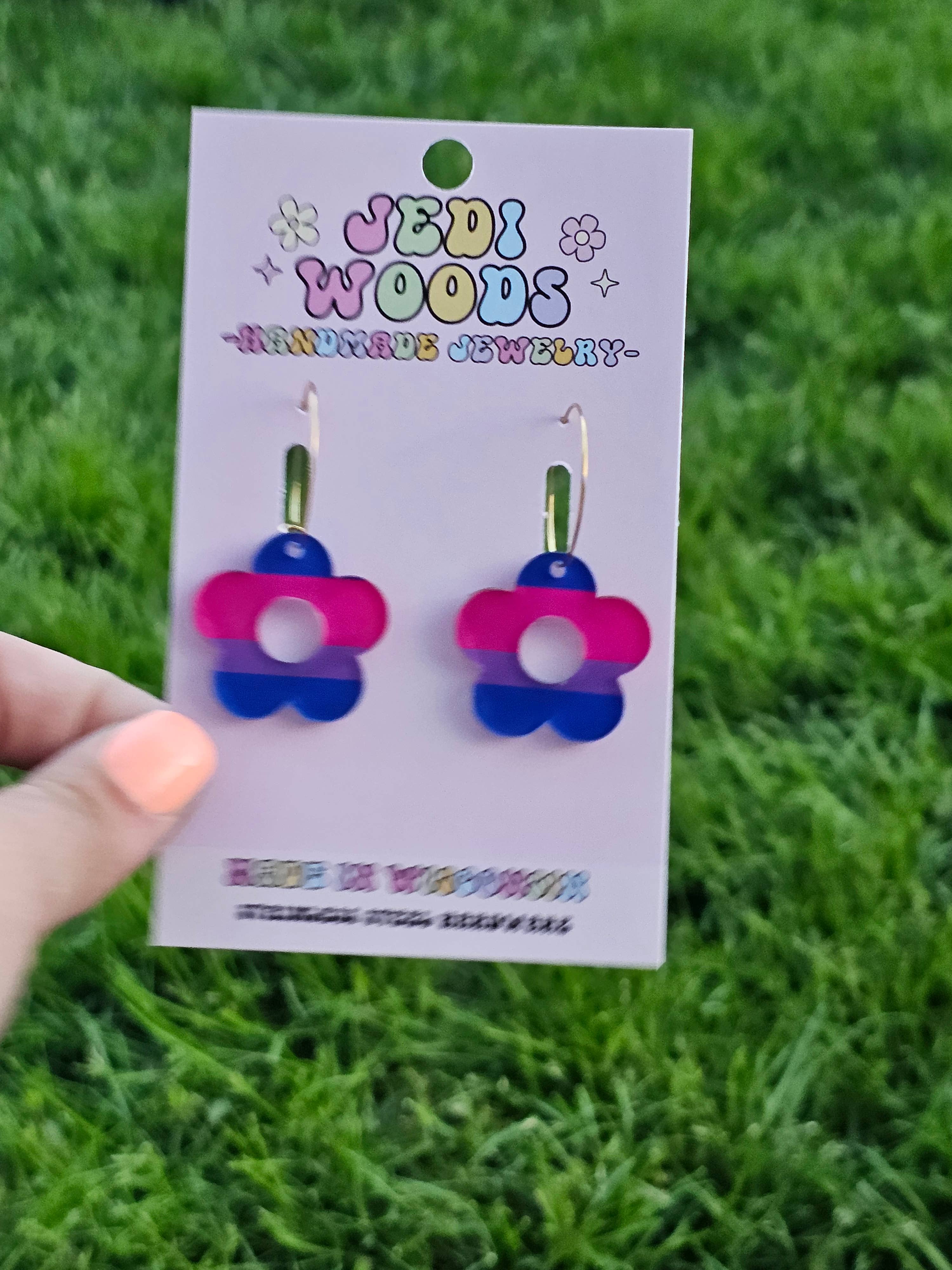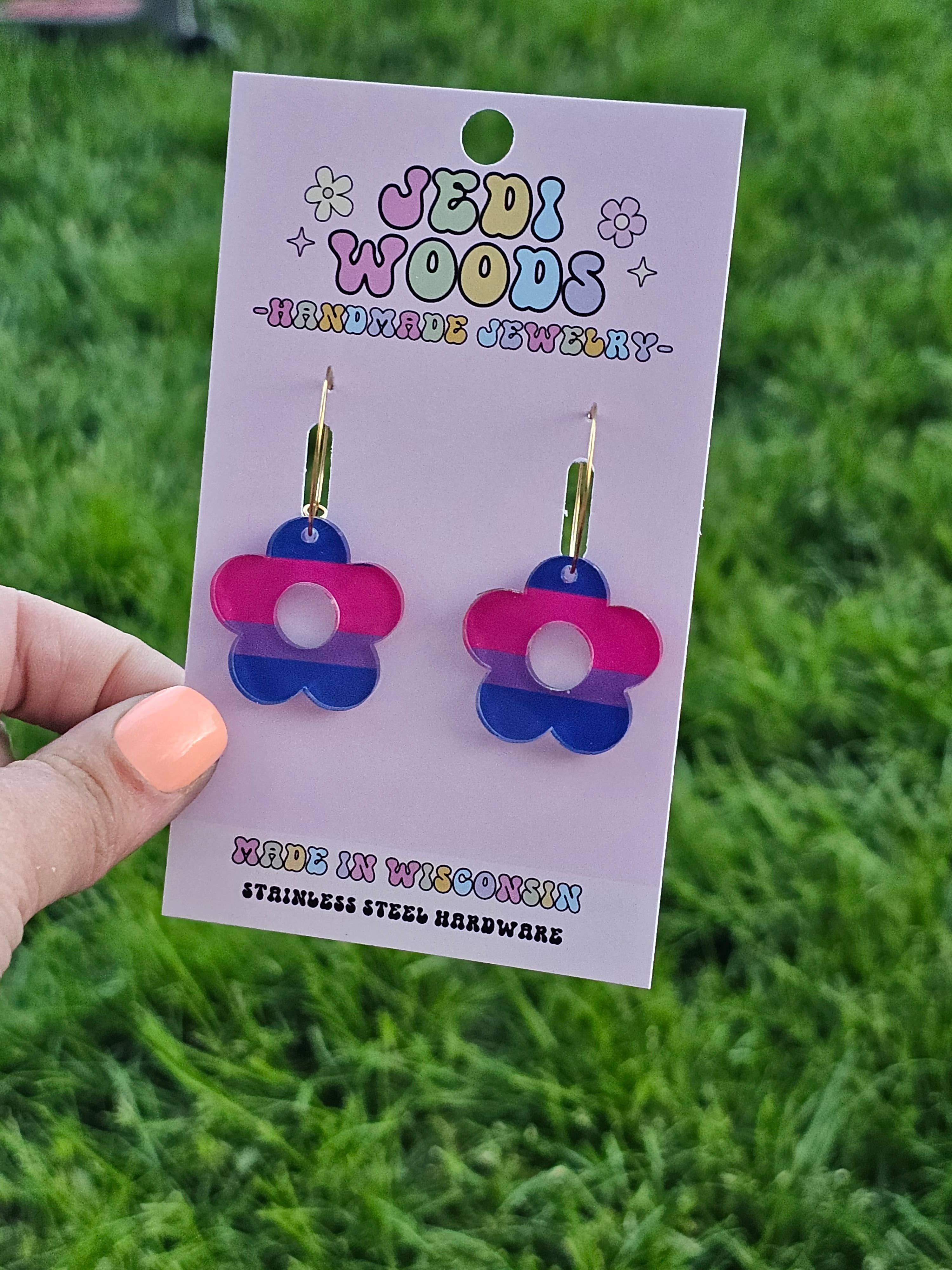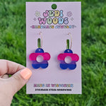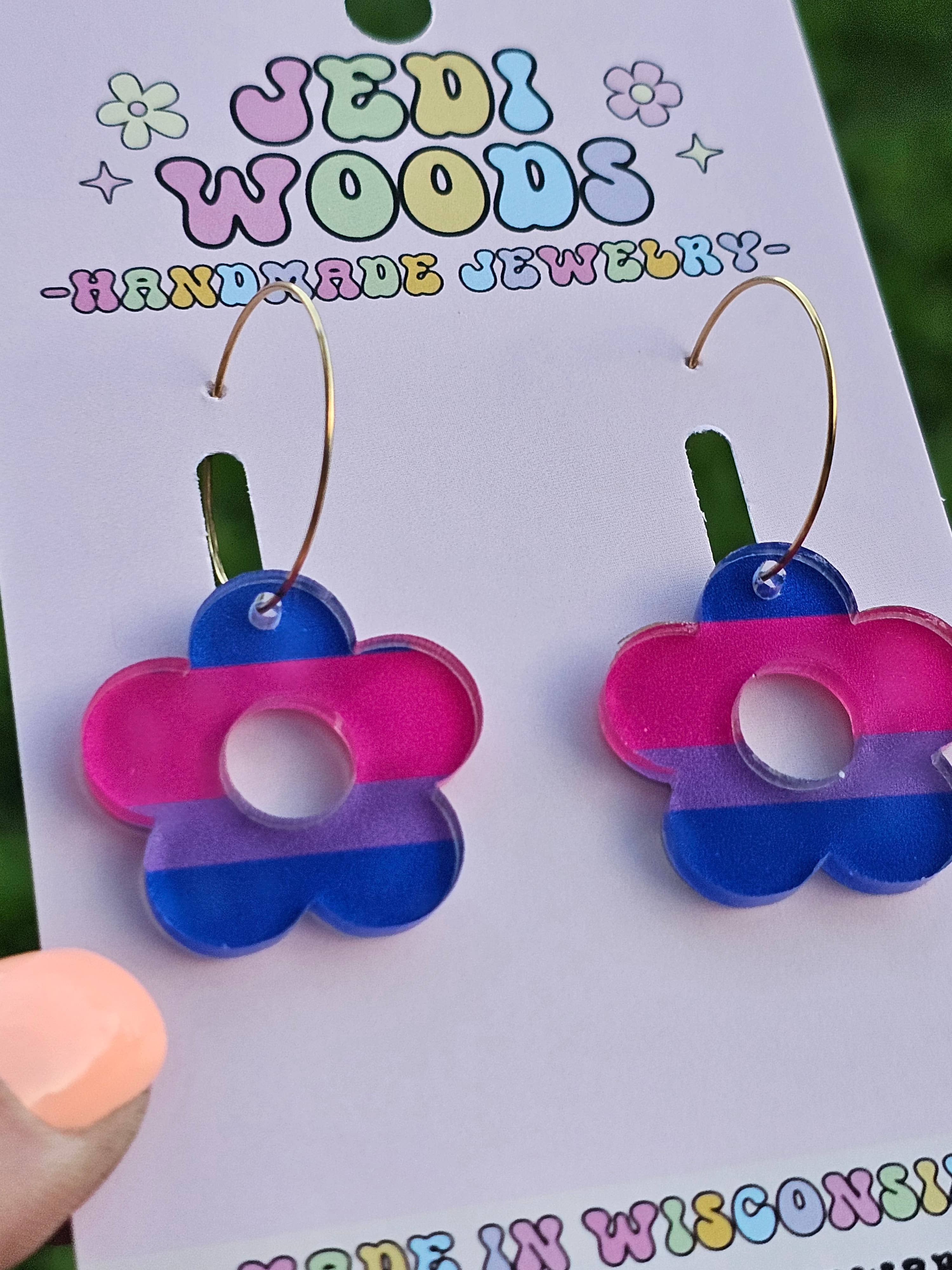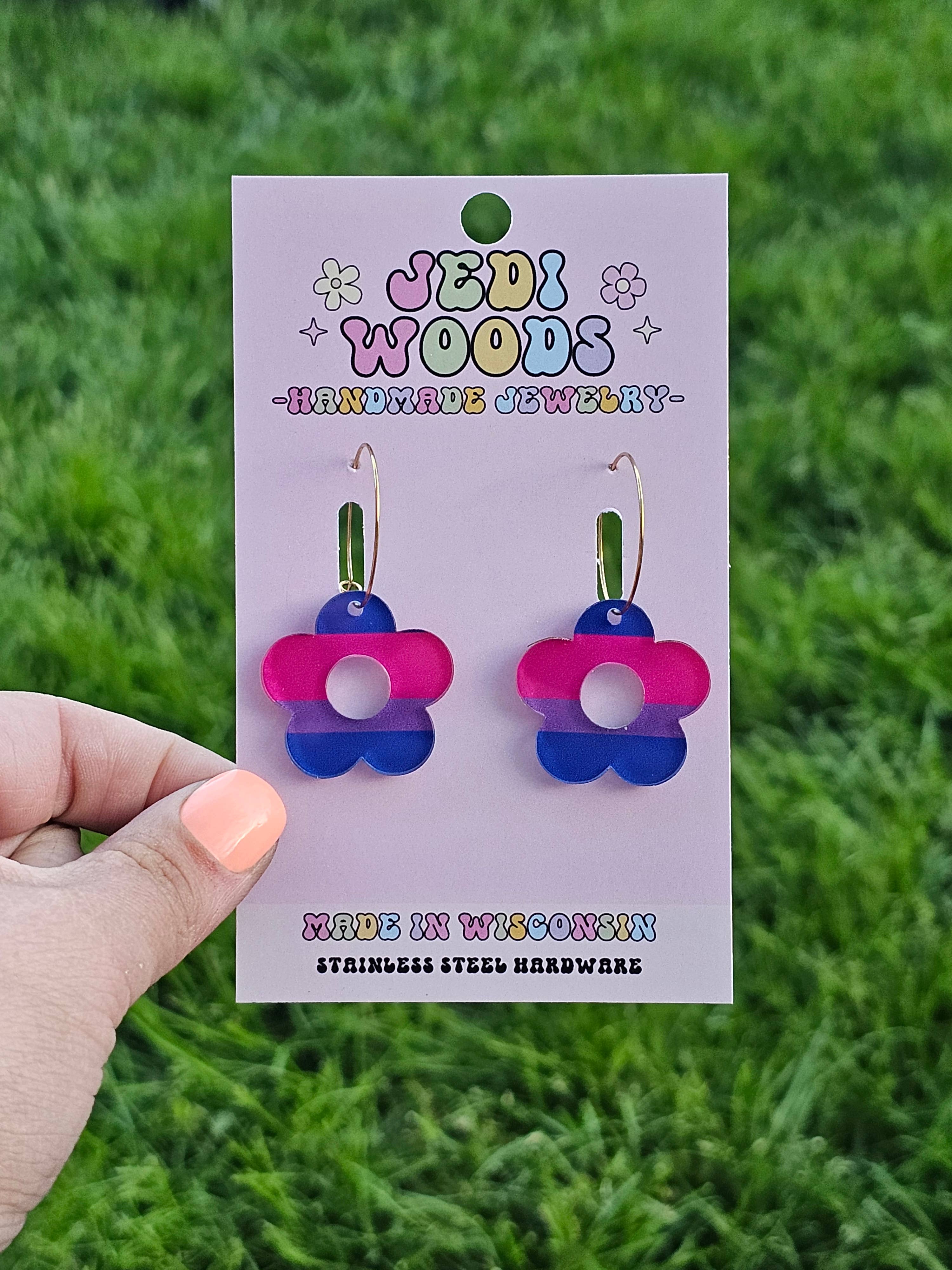 Celebrate Pride with the unique collection of Pride flag florals. The Bisexual Pride flag is uniquely discreet in a cute flower shape and accompanied by gold coated stainless steel hoops.
