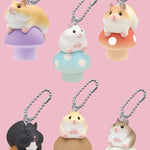 This series includes six unique variations, each with different hamster colors and mushroom styles. Whether it’s the shy white hamster on a blue polka-dot mushroom or the curious black-and-white buddy on a golden cap, each figure is full of character and detail.