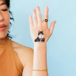 Tattly tattoos are printed with cruelty-free and vegan ink, lasting on average 2-4 days. We suggest placing on oil-free areas where skin does not stretch and keep them clean!