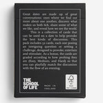 As a bonus, the cards are graded according to how probing they are (Easy, Medium and Hard) so that you can playfully match the discussion with the flow of an evening.