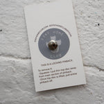 1" wide lapel pin in matte black metal and soft enamel with glossy epoxy coating. Comes on branded card with locking pinback.