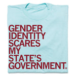 Gender Identity Scares My State's Government. A Portion of Sales Raise Money For"Glaad and the target="_blank"National Center For Transgender Equality. Cardinal Red Screen Print on Purist Blue T-shirt (50% Combed Ringspun Cotton / 50% Polyester). Cut and sewn sweatshop free. Designed and printed by Union Labor at RAYGUN.