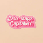 - Sticker reads, "Late-stage capitalism" in a Barbie lettering style