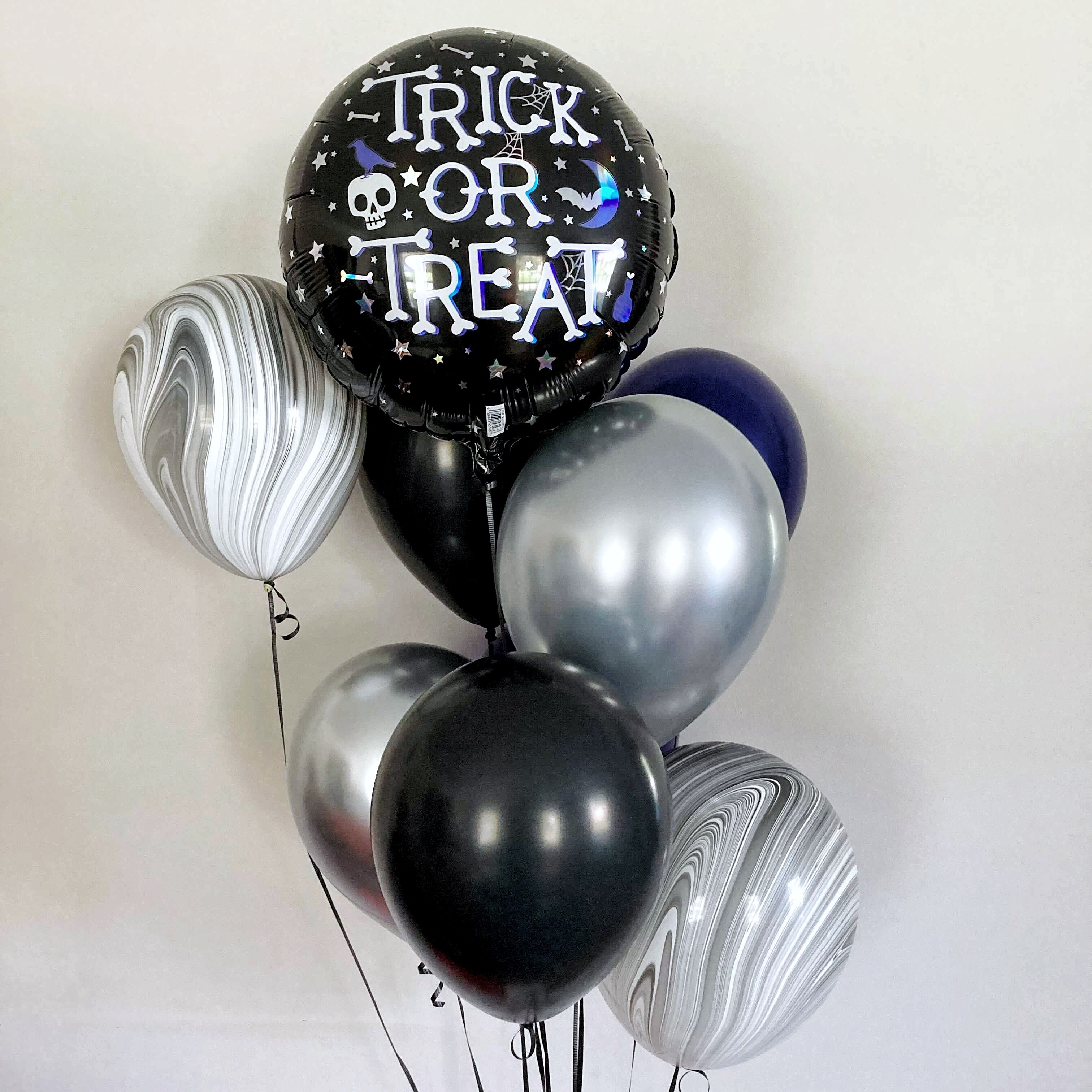 Six 11" solid latex balloons in black, navy, and chrome silver