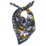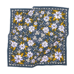 Color: Dark blue background with purple and lilac flowers with green leaves