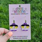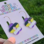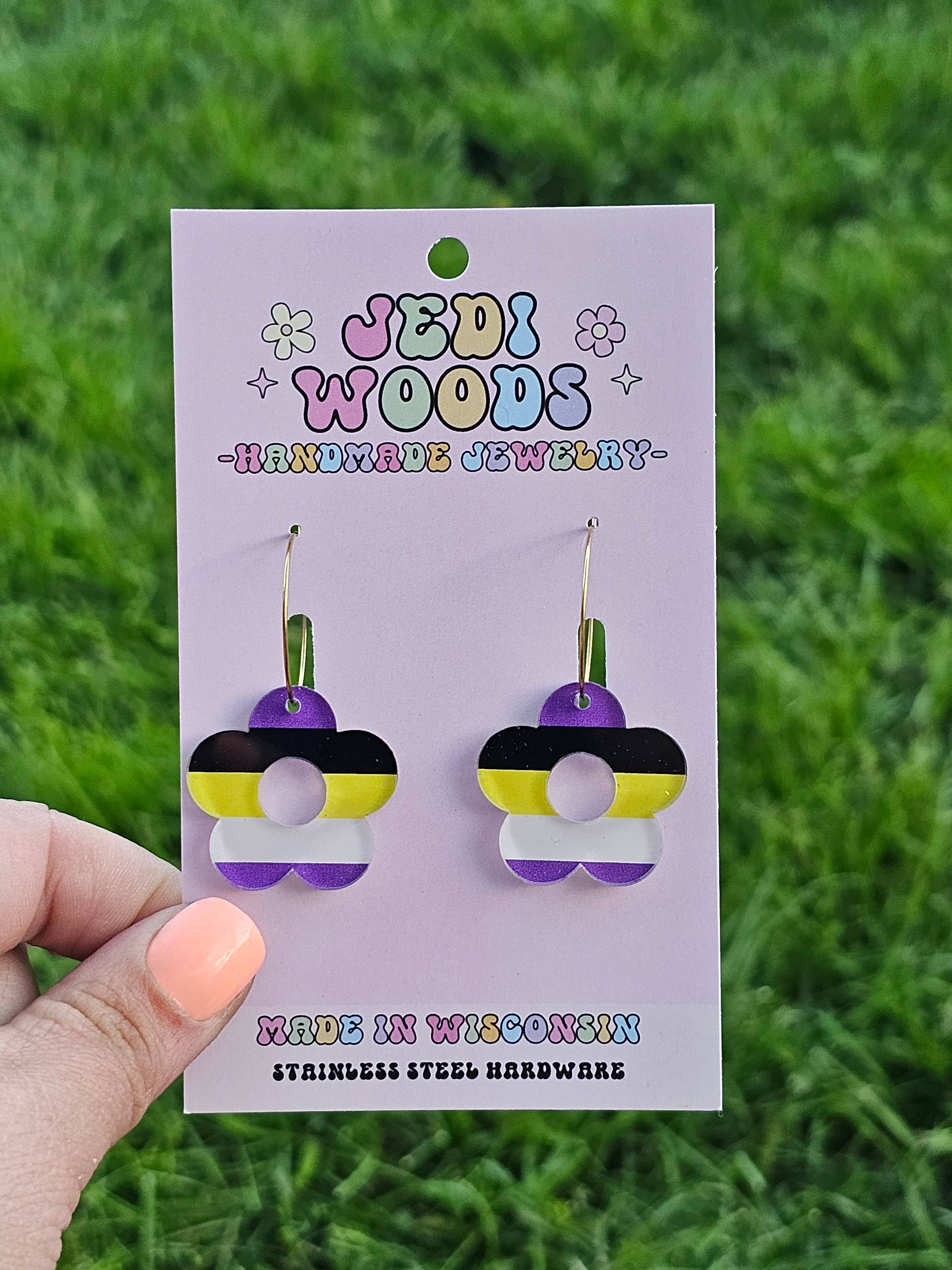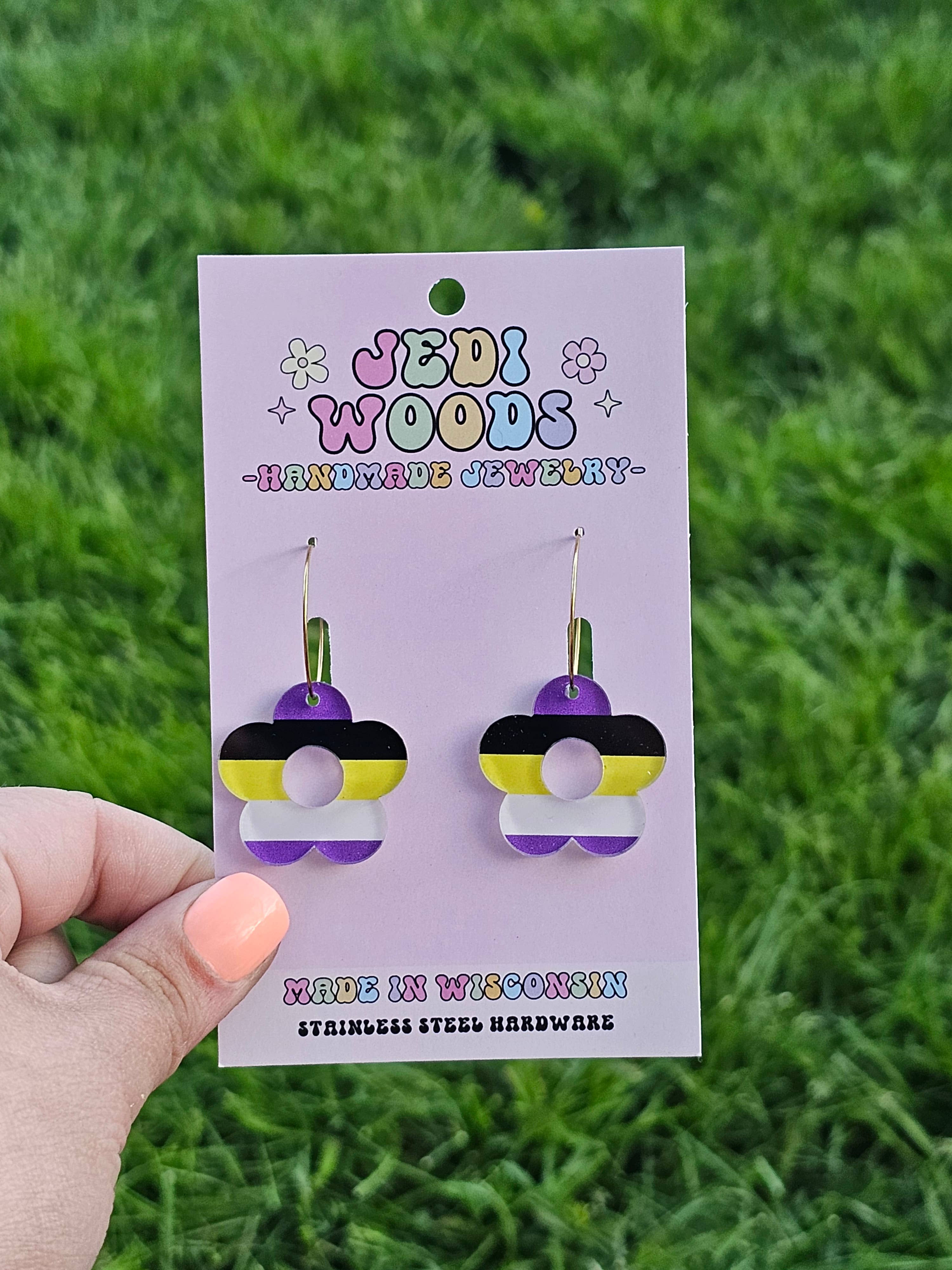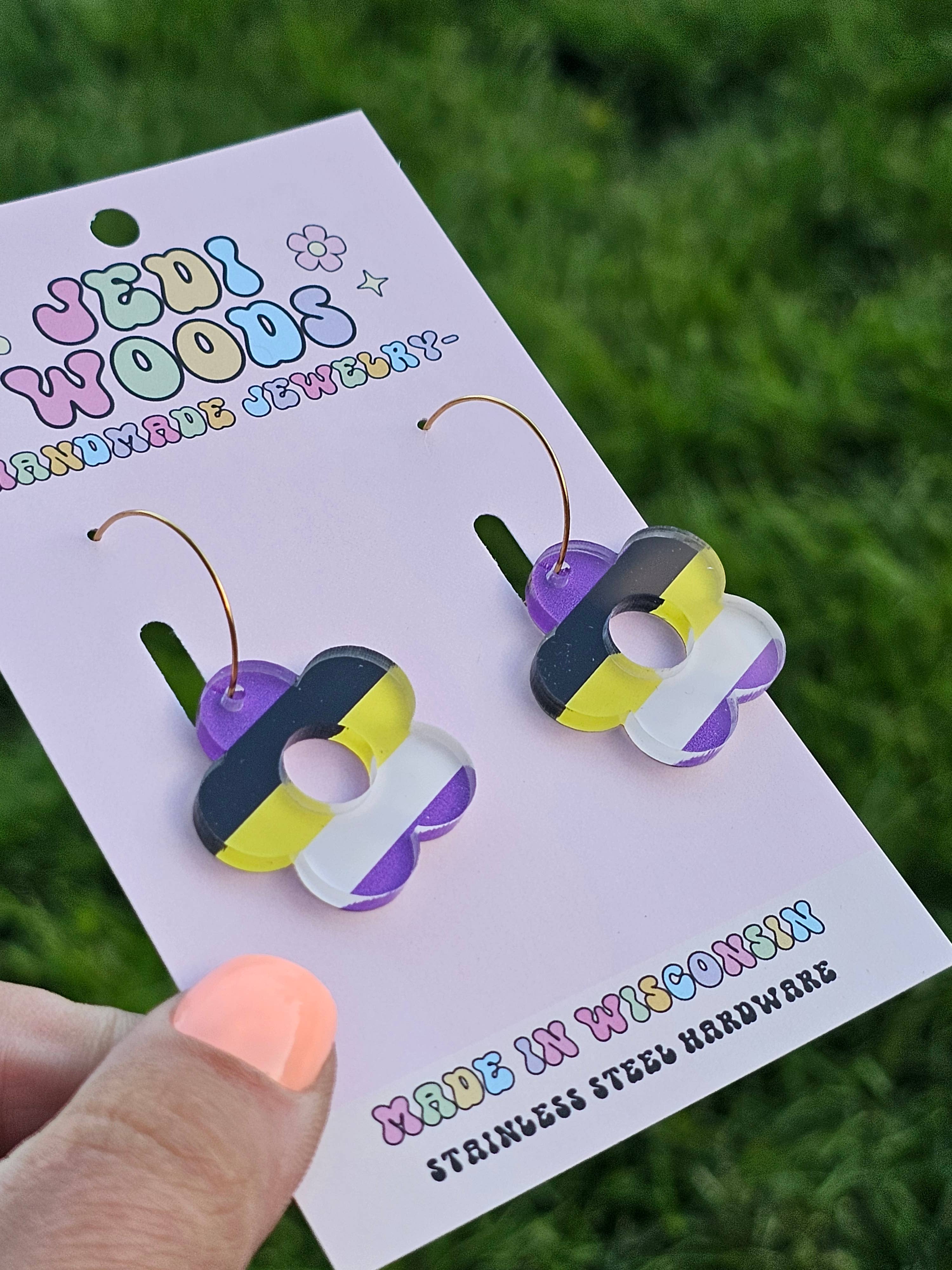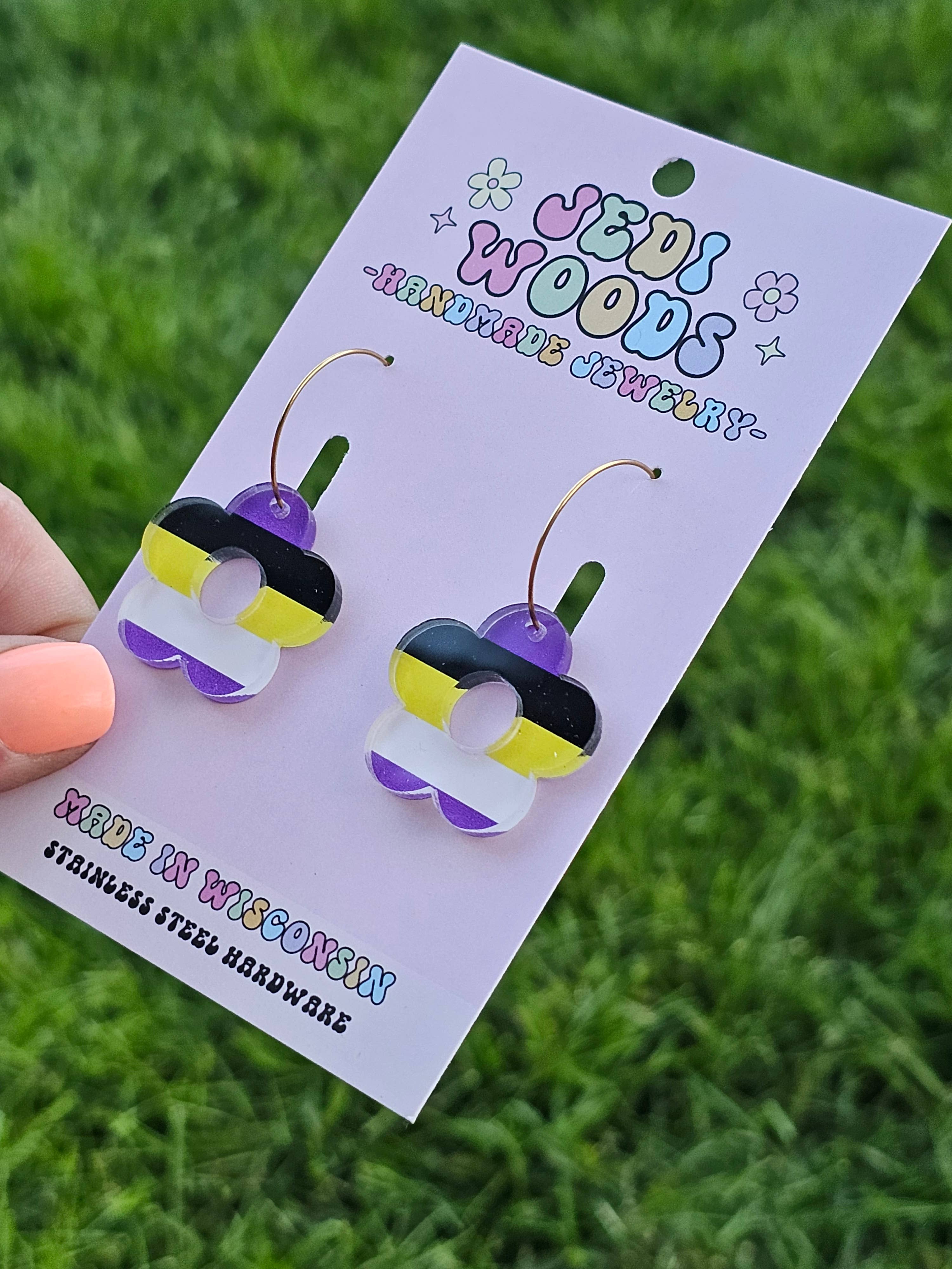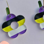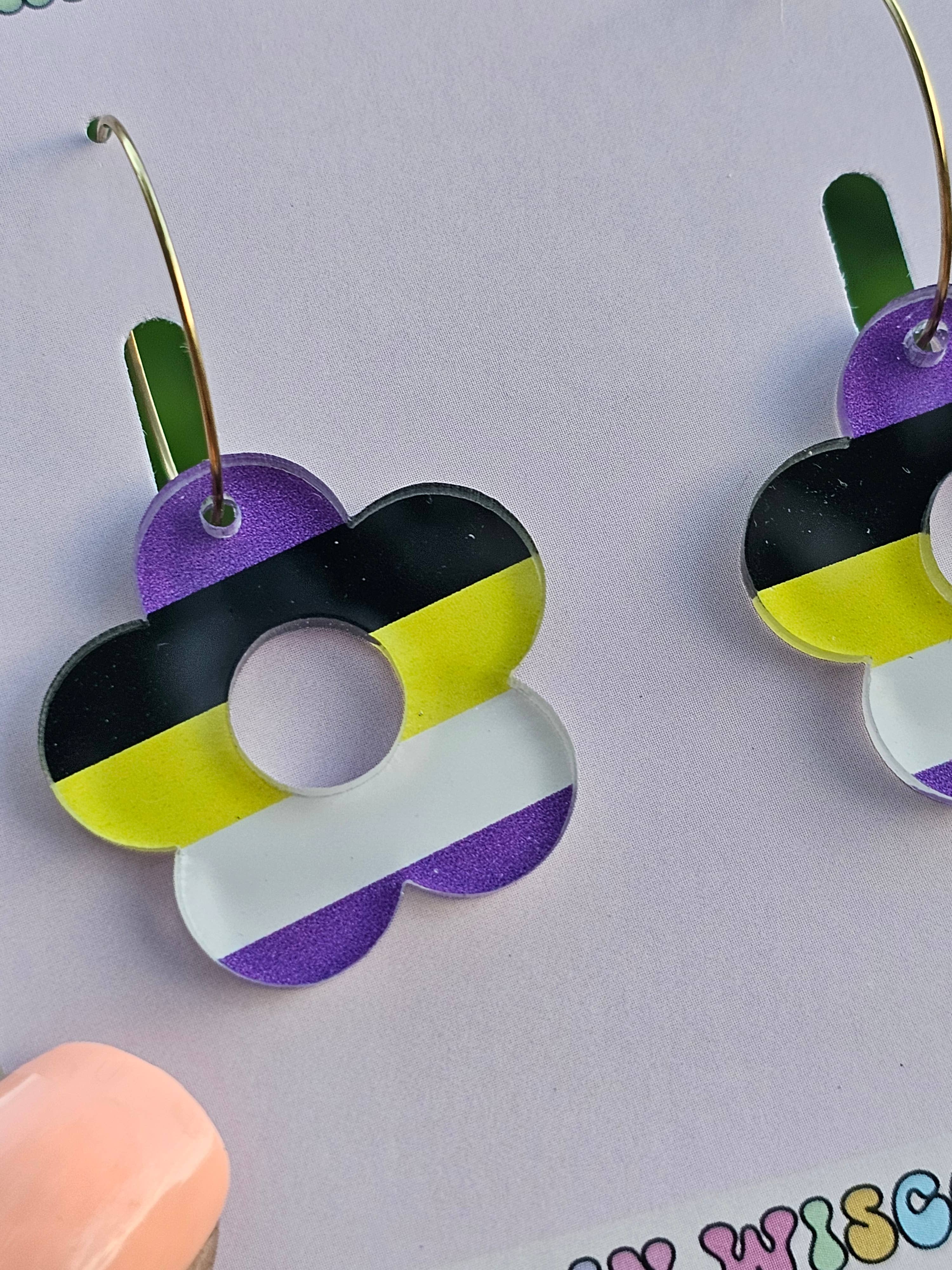 Celebrate Pride with our unique collection of Pride flag florals. Our non binary Pride flag is unique discreet in a cute flower shape and accompanied by gold coated stainless steel hoops.