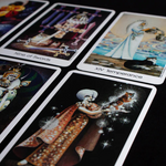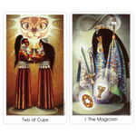 The full-color 78-card Tarot of the Cat People is set in a distant place known as the Outer Regions. Cats are the favorite animals in this alien land, where they are revered, loved and even obeyed. Combining science fiction and fantasy, this deck explores our mystical connection and fascination with felines. Each card depicts a full-length portrait of a stunning figure in ornate dress with elaborate jewelry and headdress. Cats appear everywhere, enhancing interpretation of the deck. Includes 64-page booklet.
