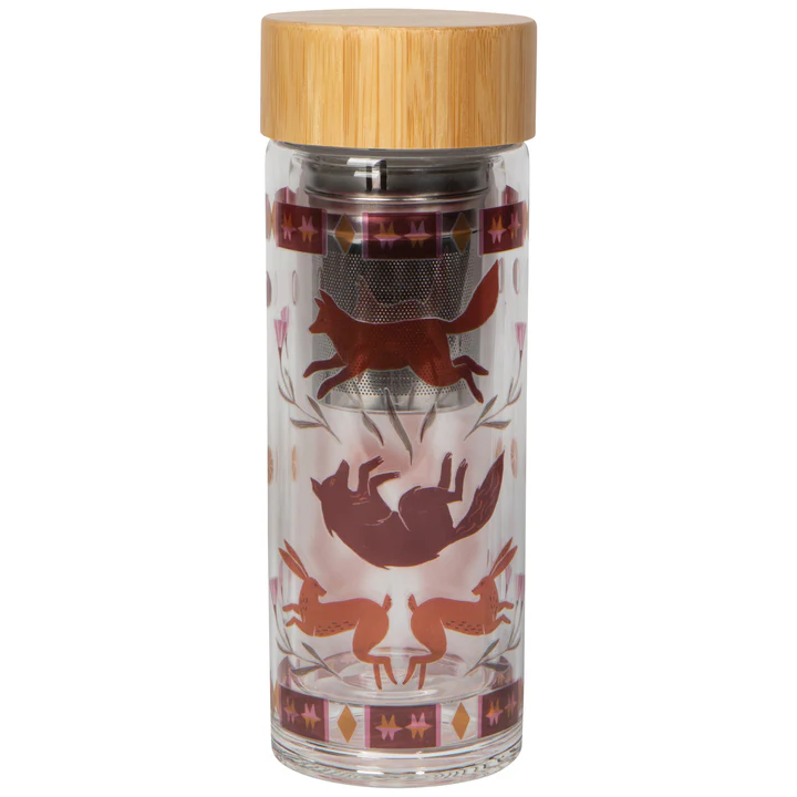 Take your tea to go with our double-walled Folktale tea infuser. Made fromborosilicate glass, this sylish bottle keeps your tea hot while remaining easy to handle. Detailed borders outline these creatures' stories with an intricate, tile-like frame. This design invites you to follow the fox and hare into a land where imagination wanders and worldly wisdom is shared through tales as old as time.