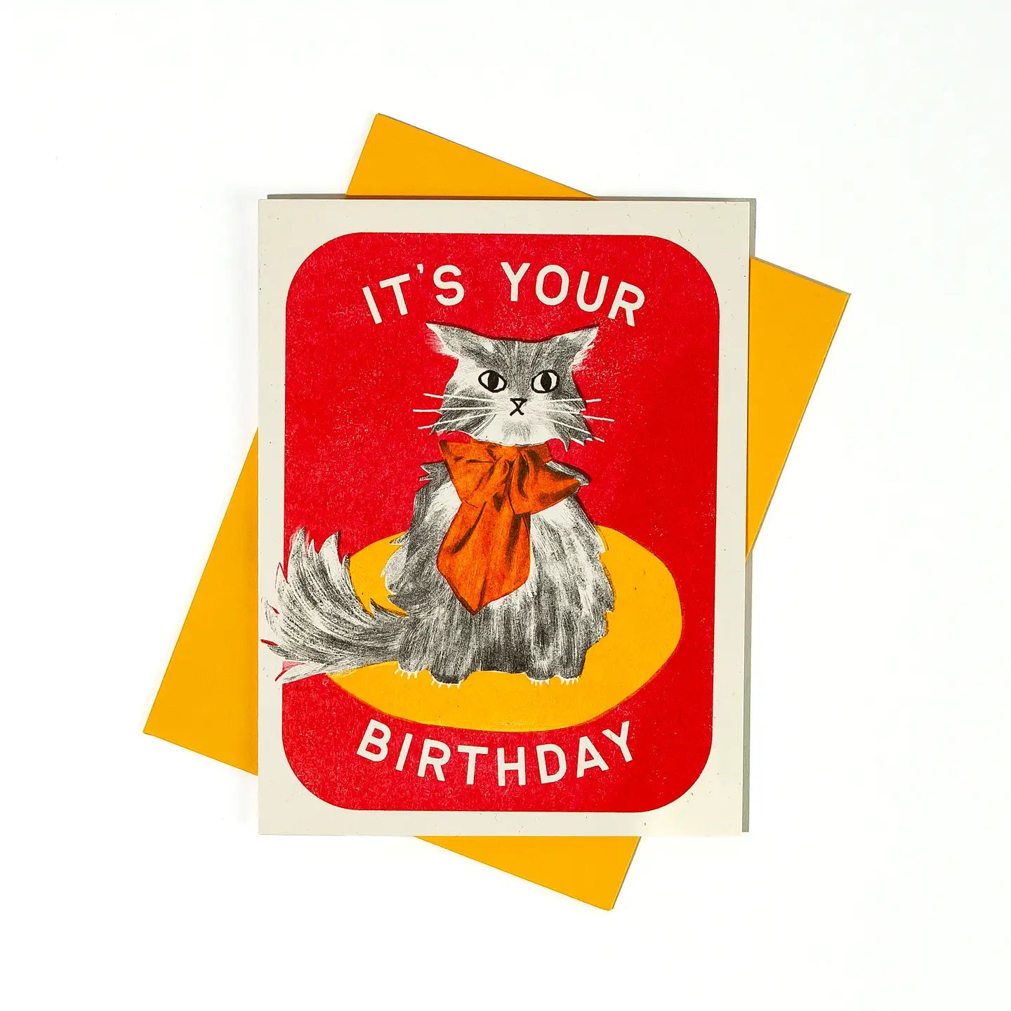 Get ready to get gussied up because it's your birthday! A fluffy cat wears a big old bow to celebrate. Risograph printed in black, bright red, and sunflower yellow