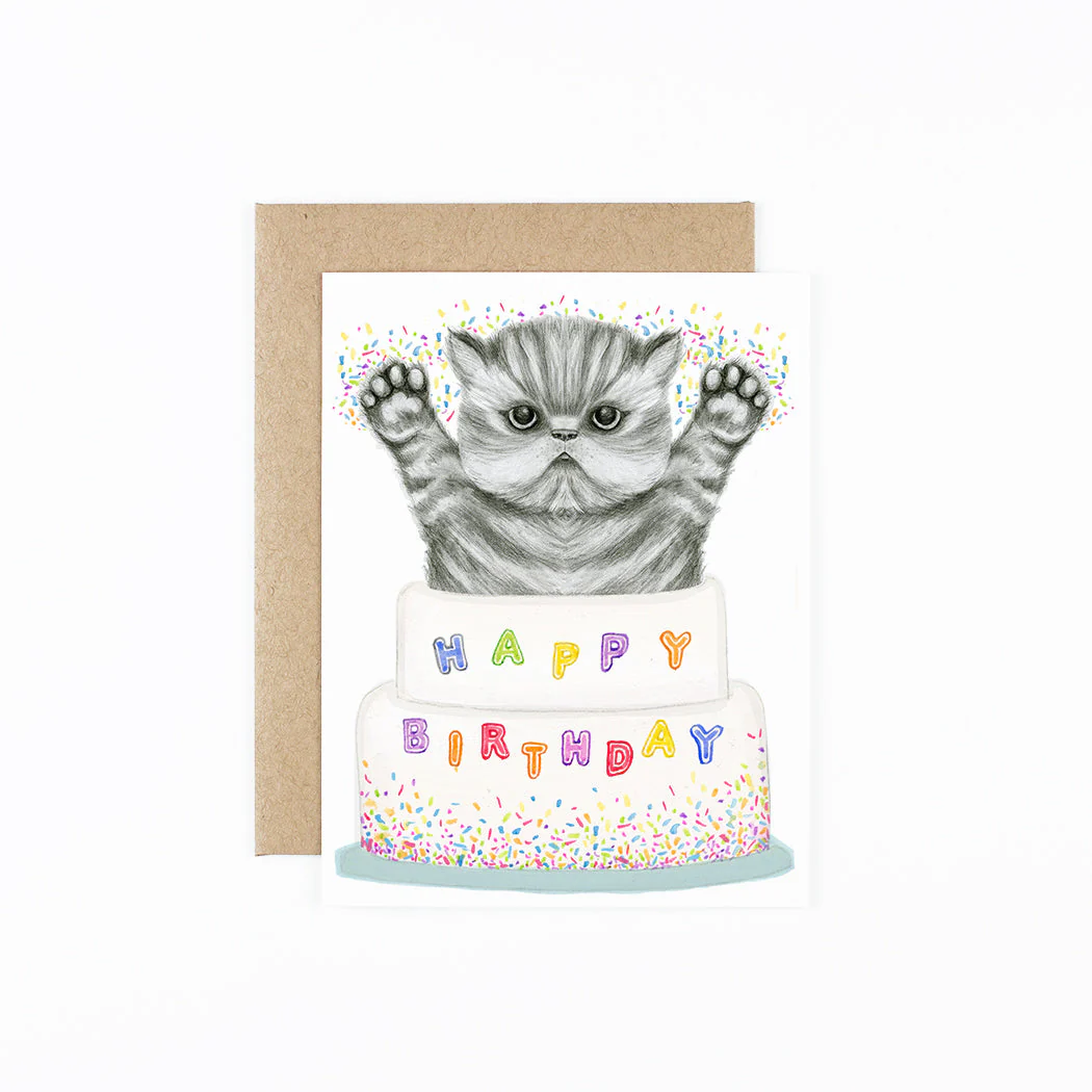 Throw the confetti! This hand-drawn kitten jumping out of a cake is purrfect for anyone who loves a little mischief on their birthday.