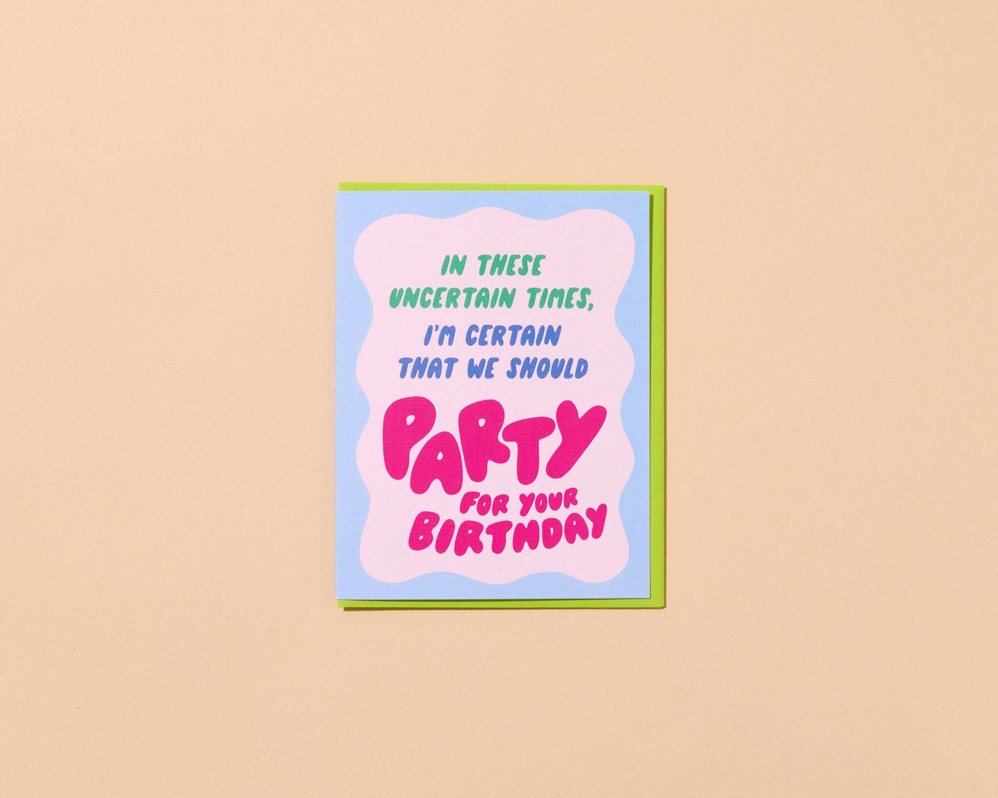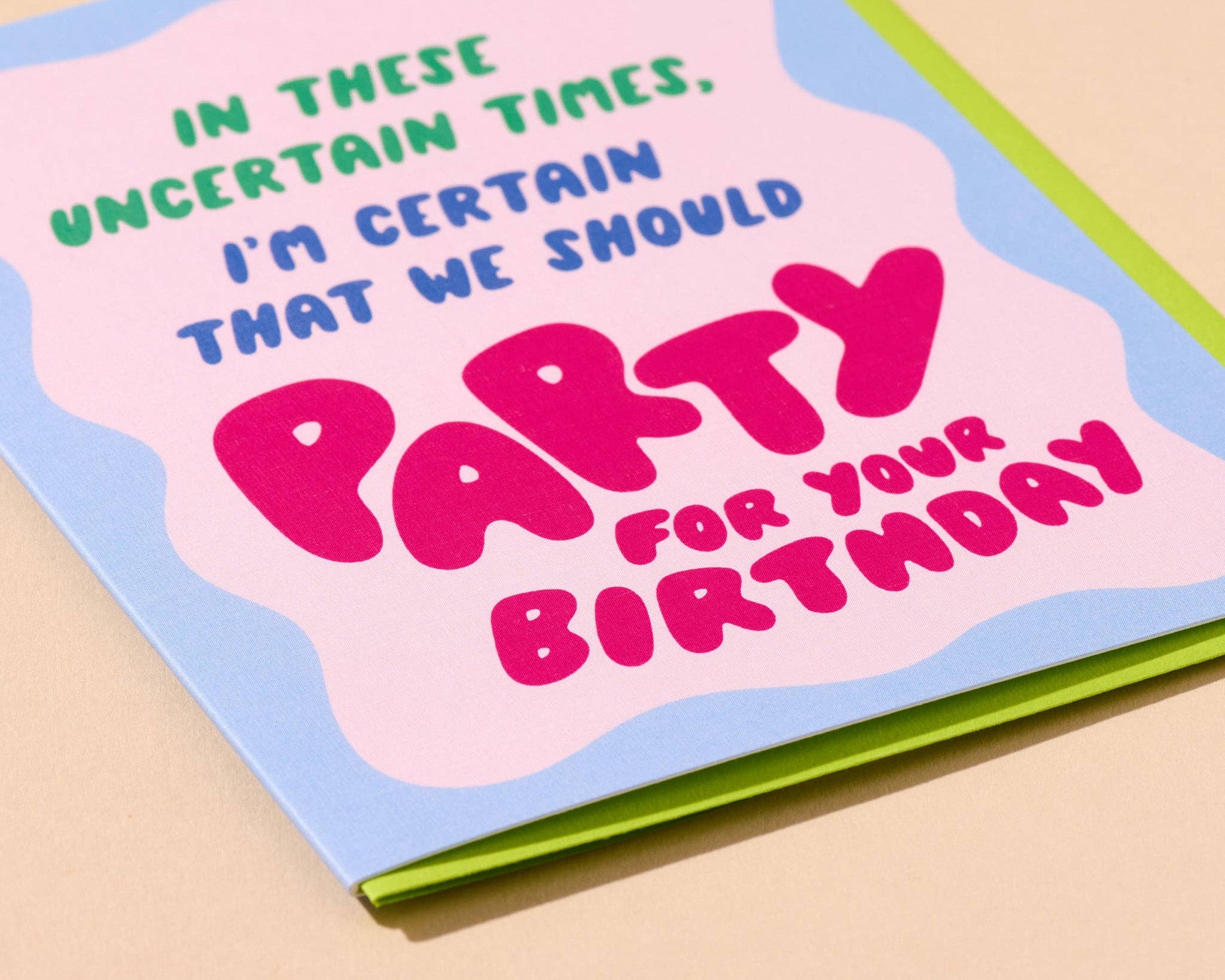There's only one thing we can be certain about right now...it's party time. Card reads, “In these uncertain times, I'm certain that we should PARTY for your birthday”