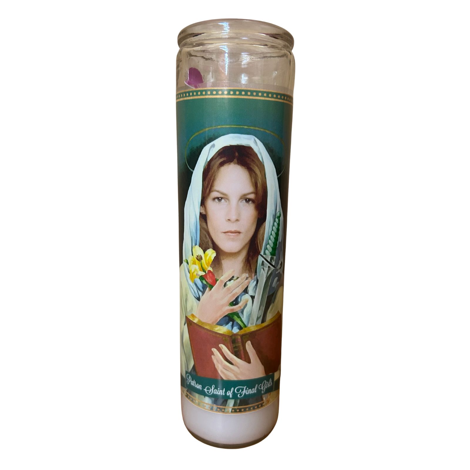 Halloween Season is upon us; even non-virgins should be picking up this Prayer Candle featuring this iconic Woman of Horror. The image is photoshopped then printed and pasted to a traditional "7 day" white altar candle.