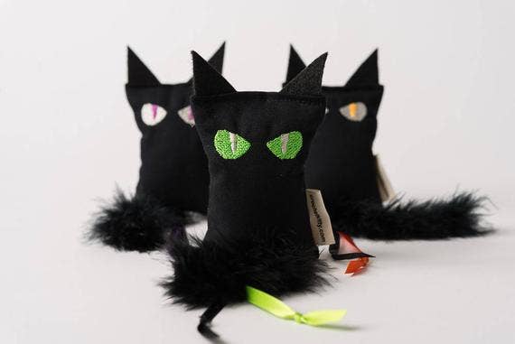 Cats can’t get enough of these spooky black catnip cats. They love hugging them with their front paws and get a kick out of the feather boa tail and ribbon streamers. Great impulse buy at the counter! Eyes are embroidered in three different colors. Comes on our beautiful hanging tags with barcode on back.