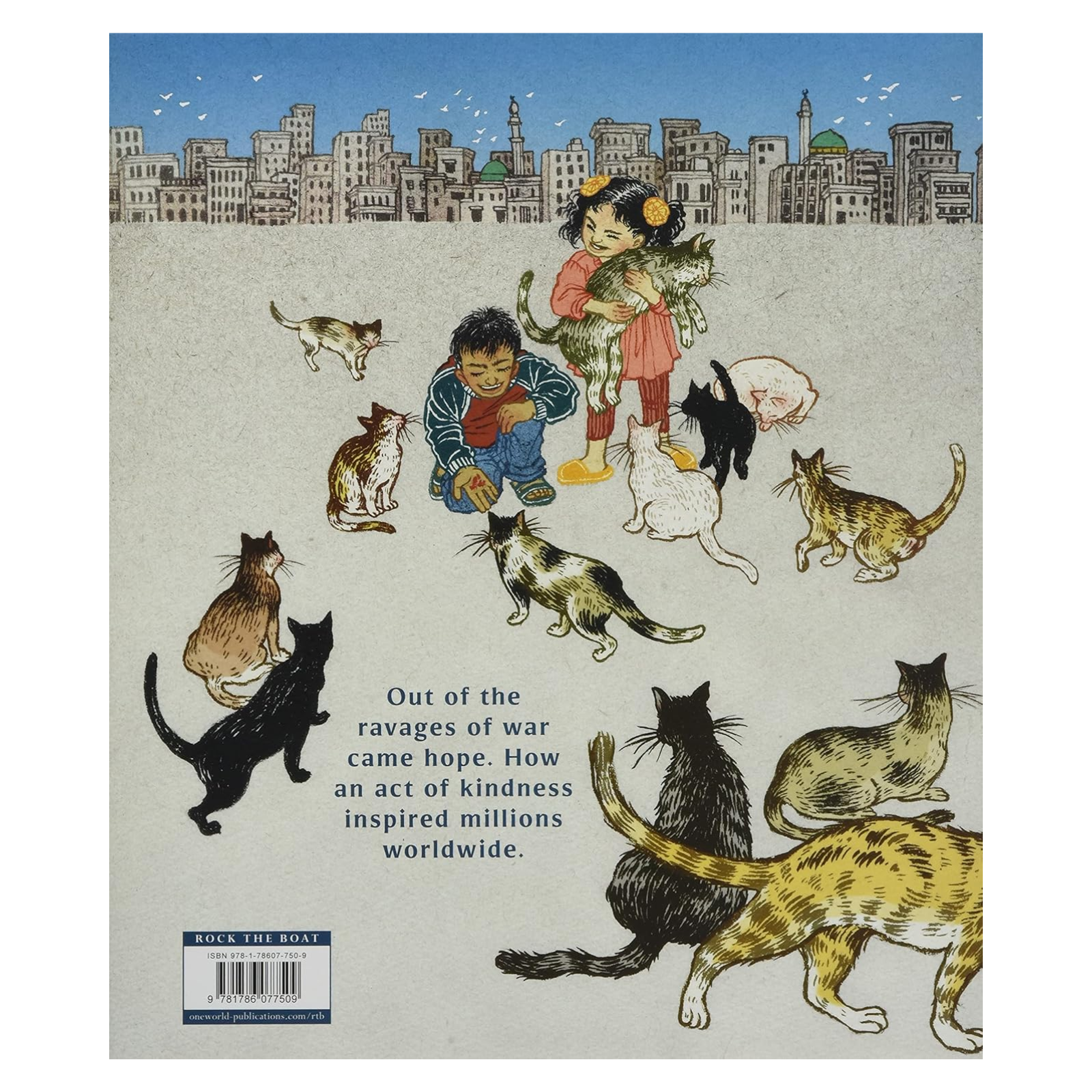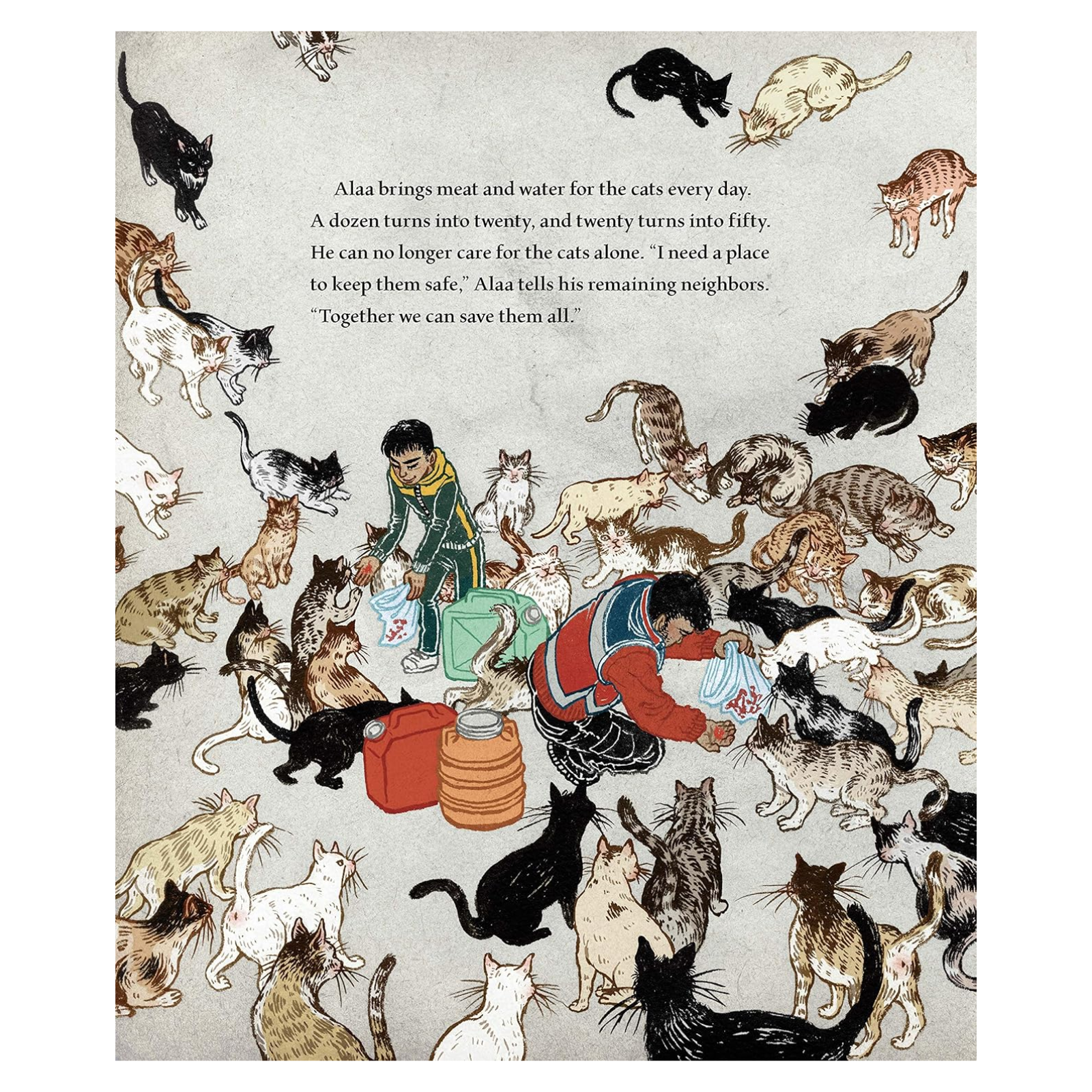 Alaa loves Aleppo, but when war comes his neighbors flee to safety, leaving their many pets behind. Alaa decides to stay—he can make a difference by driving an ambulance, carrying the sick and wounded to safety. One day he hears hungry cats calling out to him on his way home. They are lonely and scared, just like him. He feeds and pets them to let them know they are loved. The next day more cats come, and then even more! There are too many for Alaa to take care of on his own. Alaa has a big heart, but he will need help from others if he wants to keep all of his new friends safe.