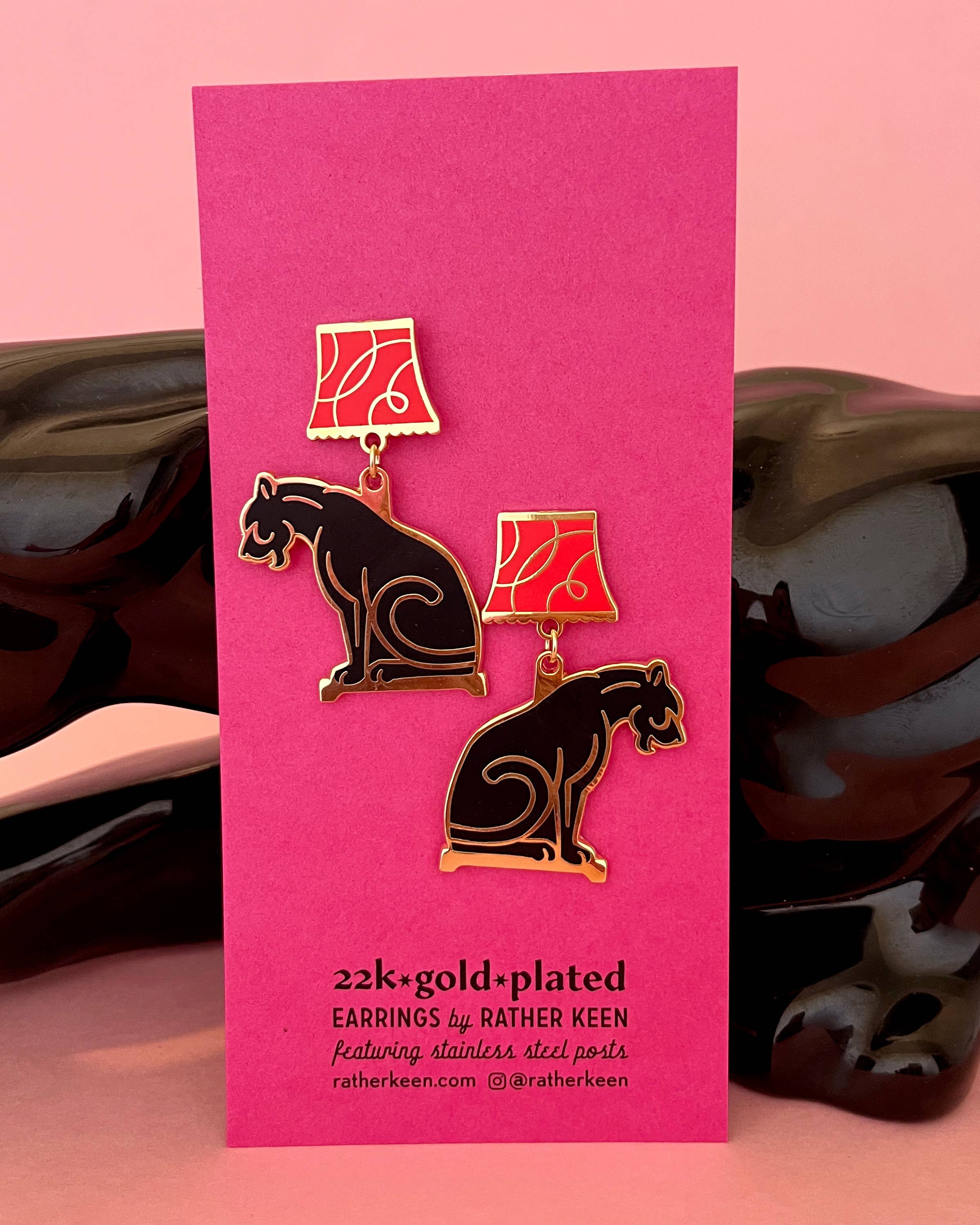 When I’m antiquing I always keep an eye out for mid-20th-century ceramic panthers. Sometimes they’re a planter, sometimes they’re a lamp. I have a little collection now, and I was inspired to design panther earrings that look like vintage lamps.