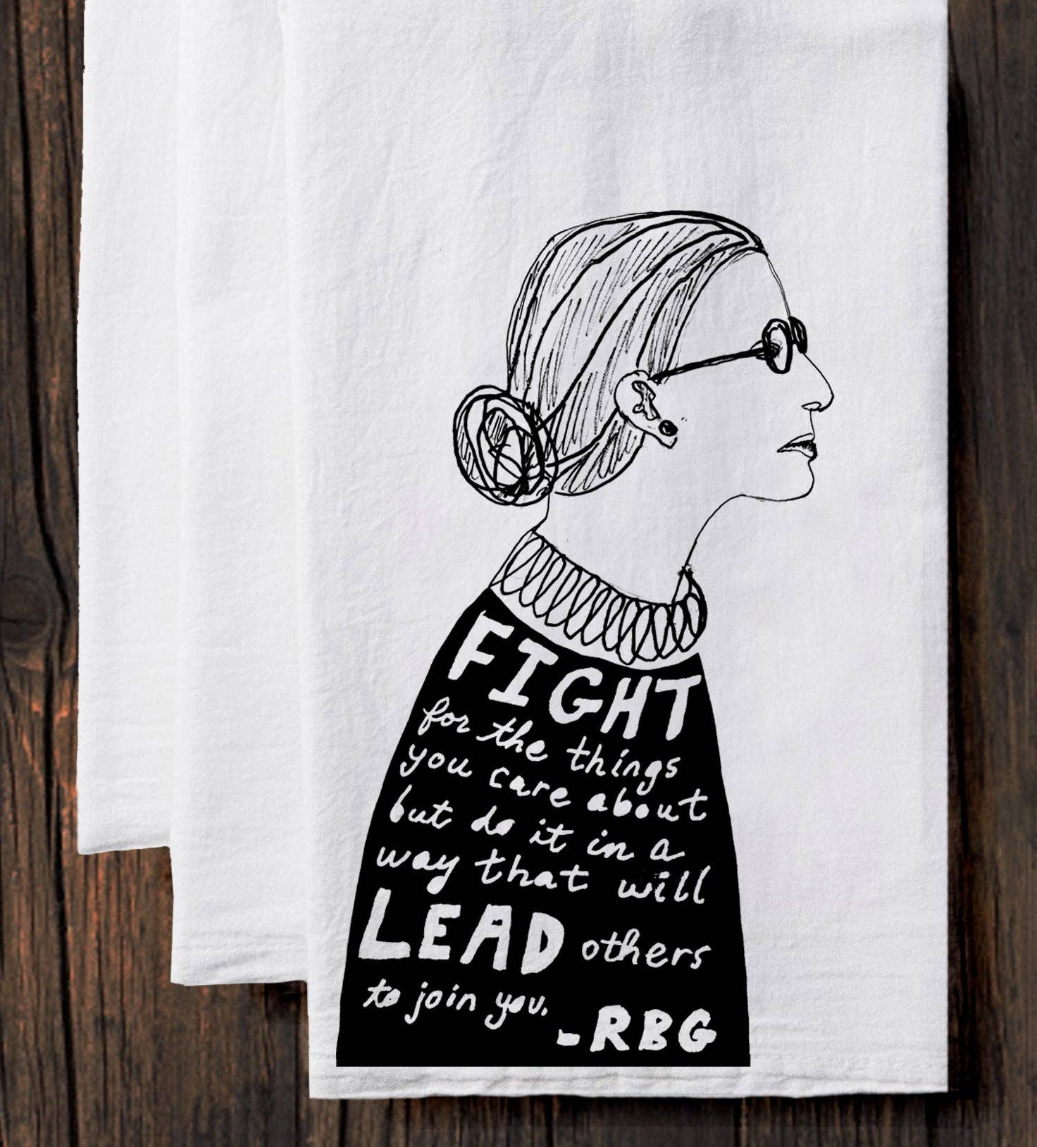 RBG! Perfect for a housewarming gift or to display in your own kitchen or bathroom. Hand-drawn with love by Megan. Each piece is screen printed by hand in Uptown Westerville (Ohio) using water-based, environmentally-friendly ink on high-quality, super soft tea towel. 100% Cotton flour sack towel with a loop for hanging.