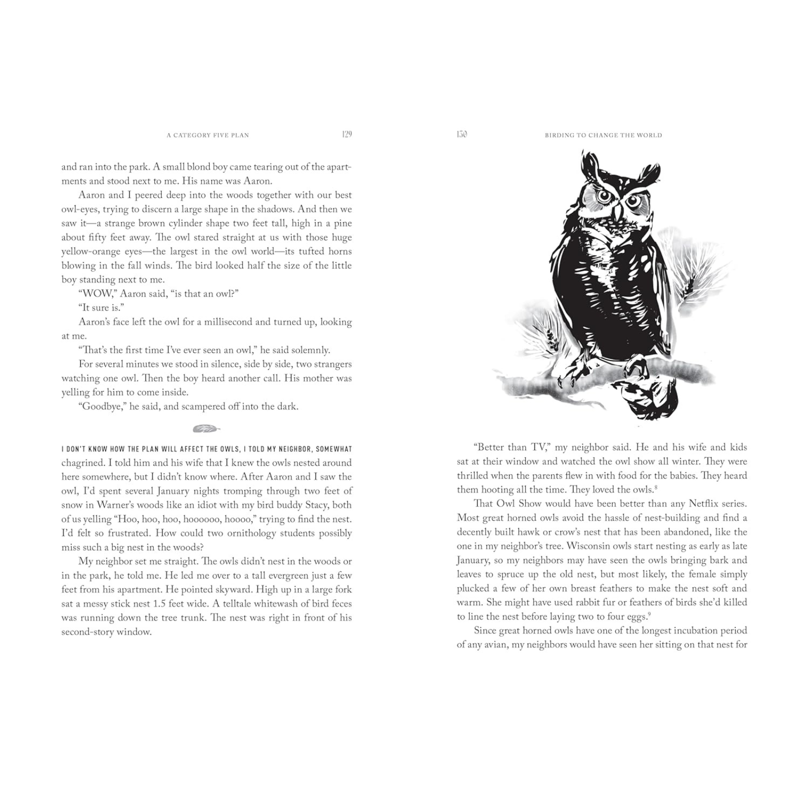 Enter a scrappy cast of feathered characters—first a cardinal, urban parrots, and sparrows, then a catbird, owls, a bittern, and a woodcock—that cheered her up and showed her a new path. Inspired, O'Kane moved to Madison, Wisconsin, to pursue an environmental studies PhD. There she became a full-on bird obsessive—logging hours in a stunningly biodiverse urban park, filling field notebooks with bird doings and dramas, and teaching ornithology to college students and middle-school kids.