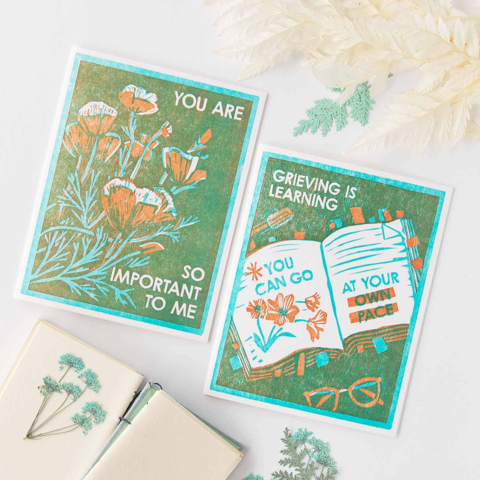 Born from their shared experiences of loss, the collection offers honest, compassionate ways to support the grieving people in your life. Each design was created together, blending visual tenderness with words that help grievers feel seen and supported.