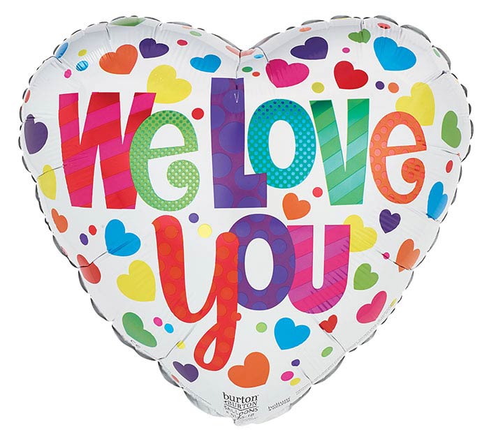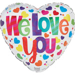 Helium-filled "We Love You" heart shaped foil balloon.