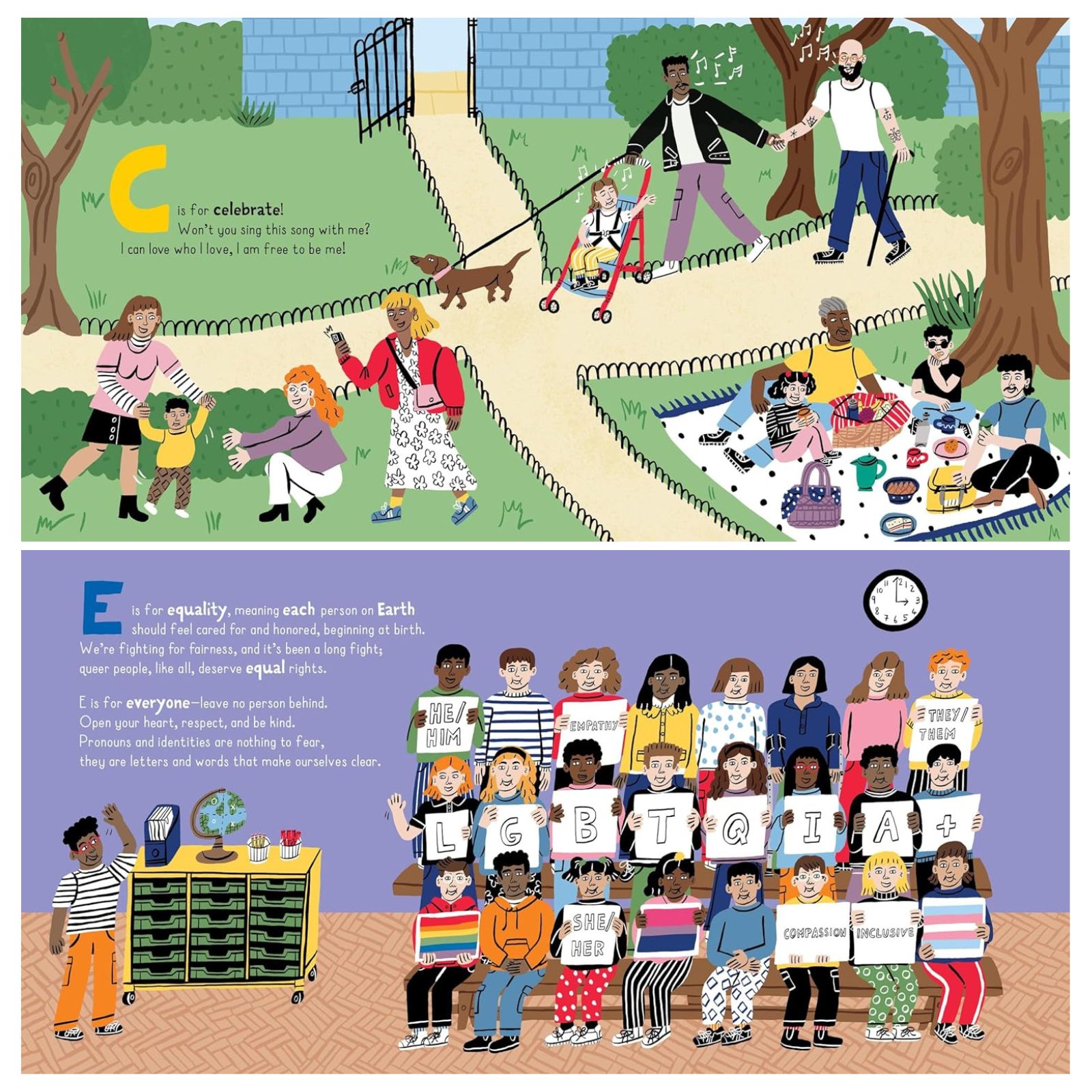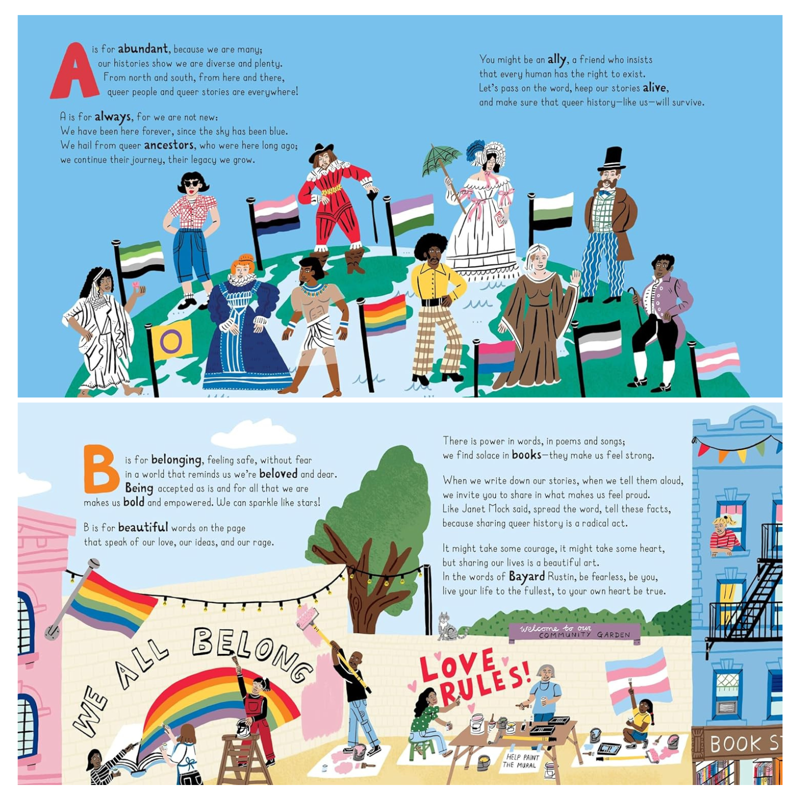 This is a book of people, of ideas, of accomplishments and events. It’s a book about Allies and Ancestors, about Belonging and Being accepted, about Hope, Knowledge, and Love. About historic moments like Stonewall, and how it changed the world. And all about Trailblazers, like Audre Lorde, James Baldwin, Josephine Baker, Harvey Milk, Barbara Jordan, George Takei, Elliot Page, and Sally Ride.