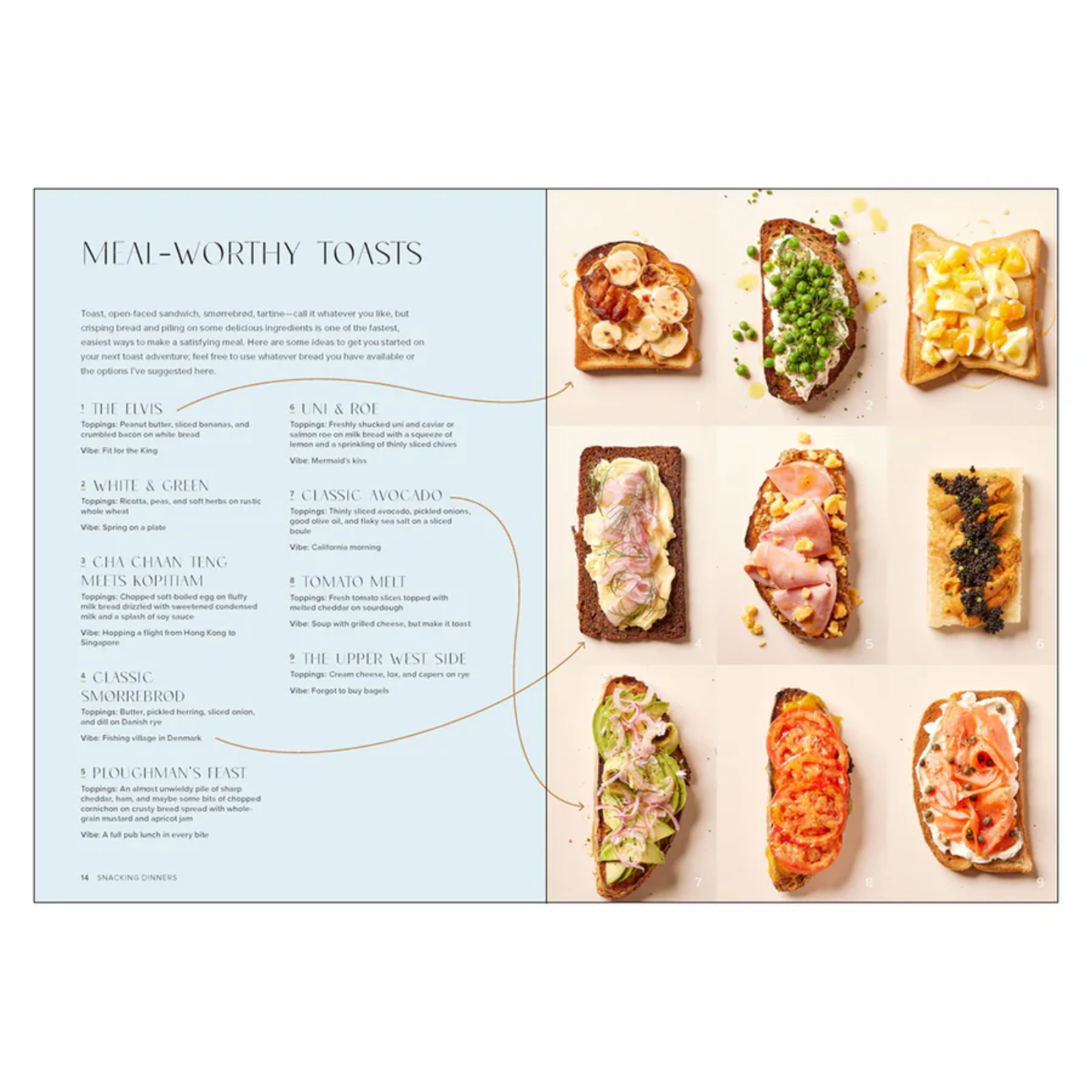 From fresh tomato on sourdough and pantry-friendly tuna hand-rolls to hummus with spiced nuts, egg flights, charcuterie boards, and even a splurge-worthy caviar toast, Snacking Dinners turns your favorite flavors into balanced, satisfying meals with recipes that offer both cooking shortcuts and culinary magic—proof that the best meals are sometimes the simplest.