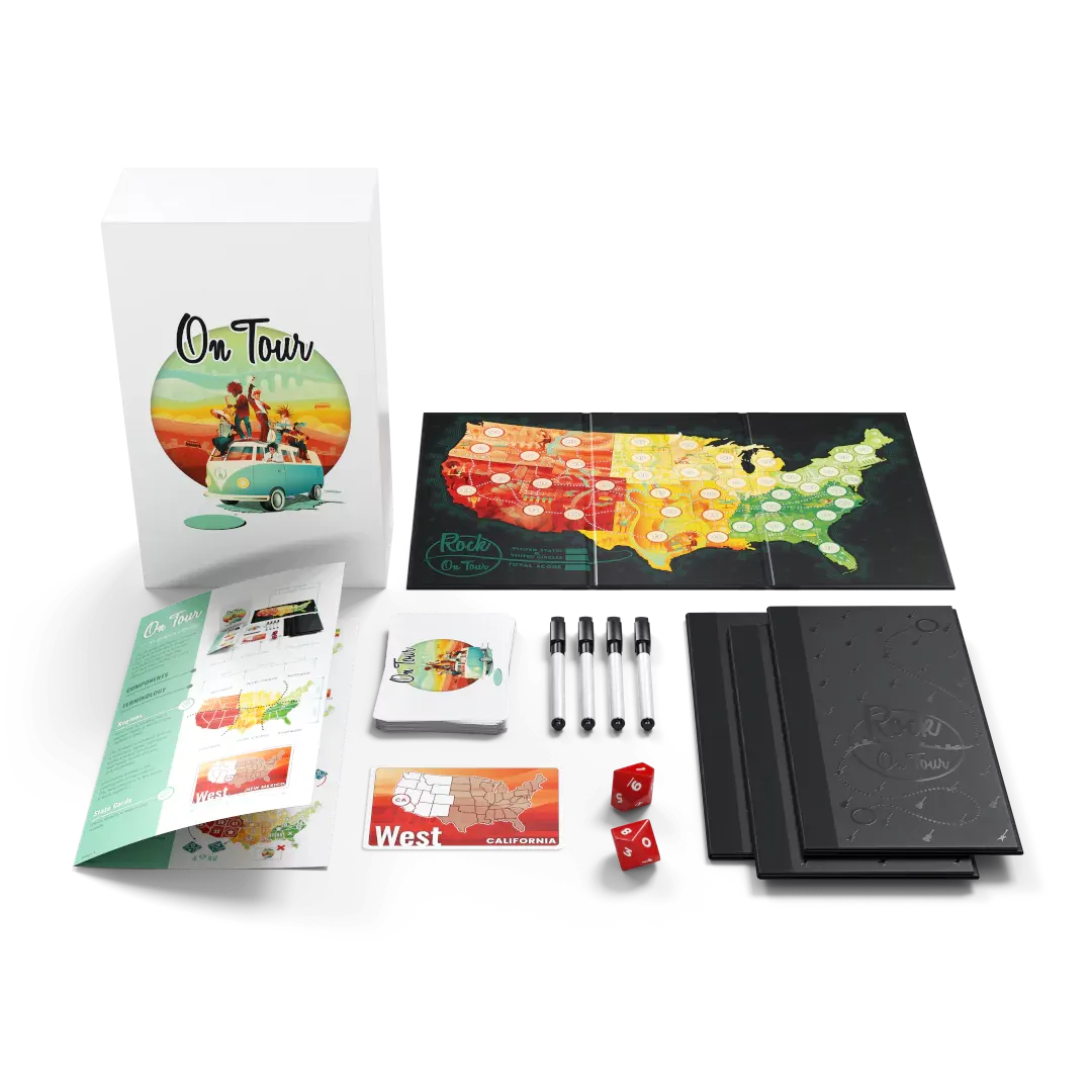 On Tour is a 20 minute route-building, roll-and-write board game with large, premium components that's good for 1 to 4 players (but can be played with as many people who have maps!).
