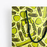 • Features an illustrated pattern of pickle jars, pickle slices and spears with a green checkerboard motif