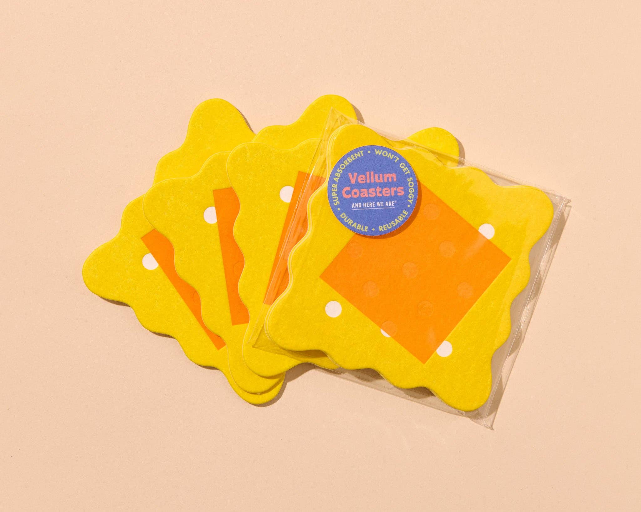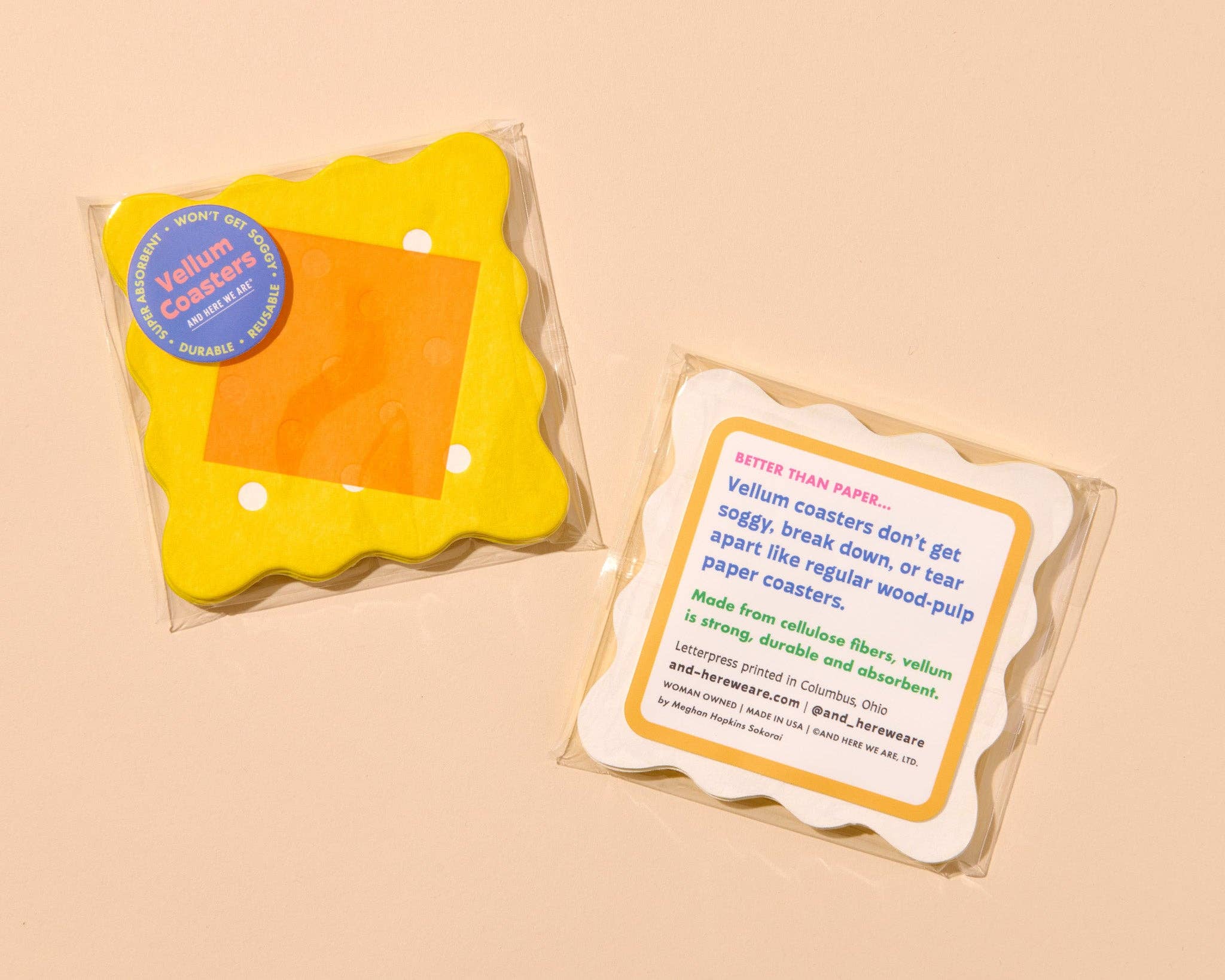 For the foodies and cheeseballs alike, these cheese coasters are sure to make any space eclectically cool. Set of 4 coasters, letterpress printed onto durable & absorbent vellum. Also available Without Cheese Our vibrant, modern coasters are letterpress printed on durable and absorbent vellum. Vellum coasters won’t get soggy, break down or tear apart like wood-pulp paper coasters. Now in smaller packs of 4 so you can mix and match!