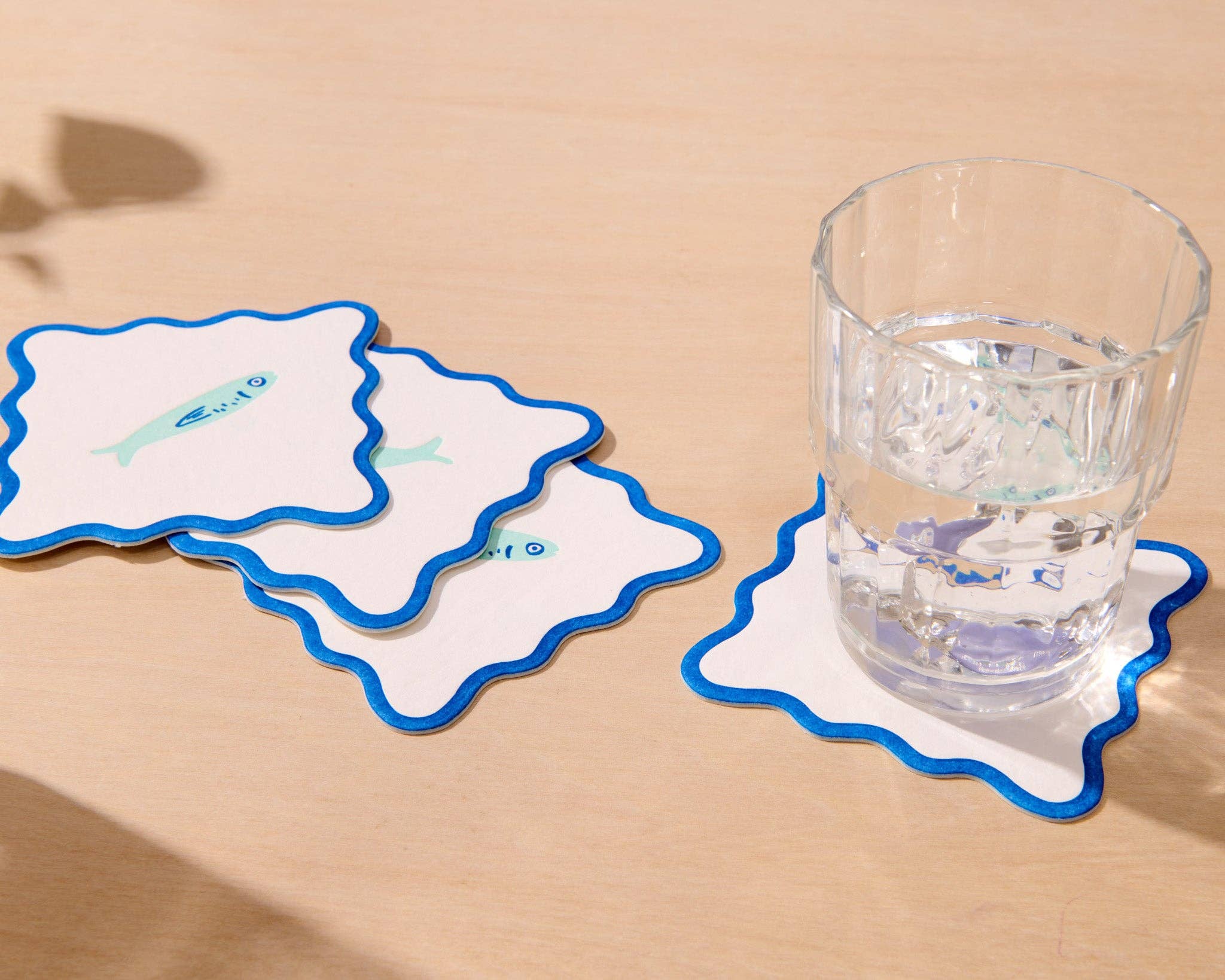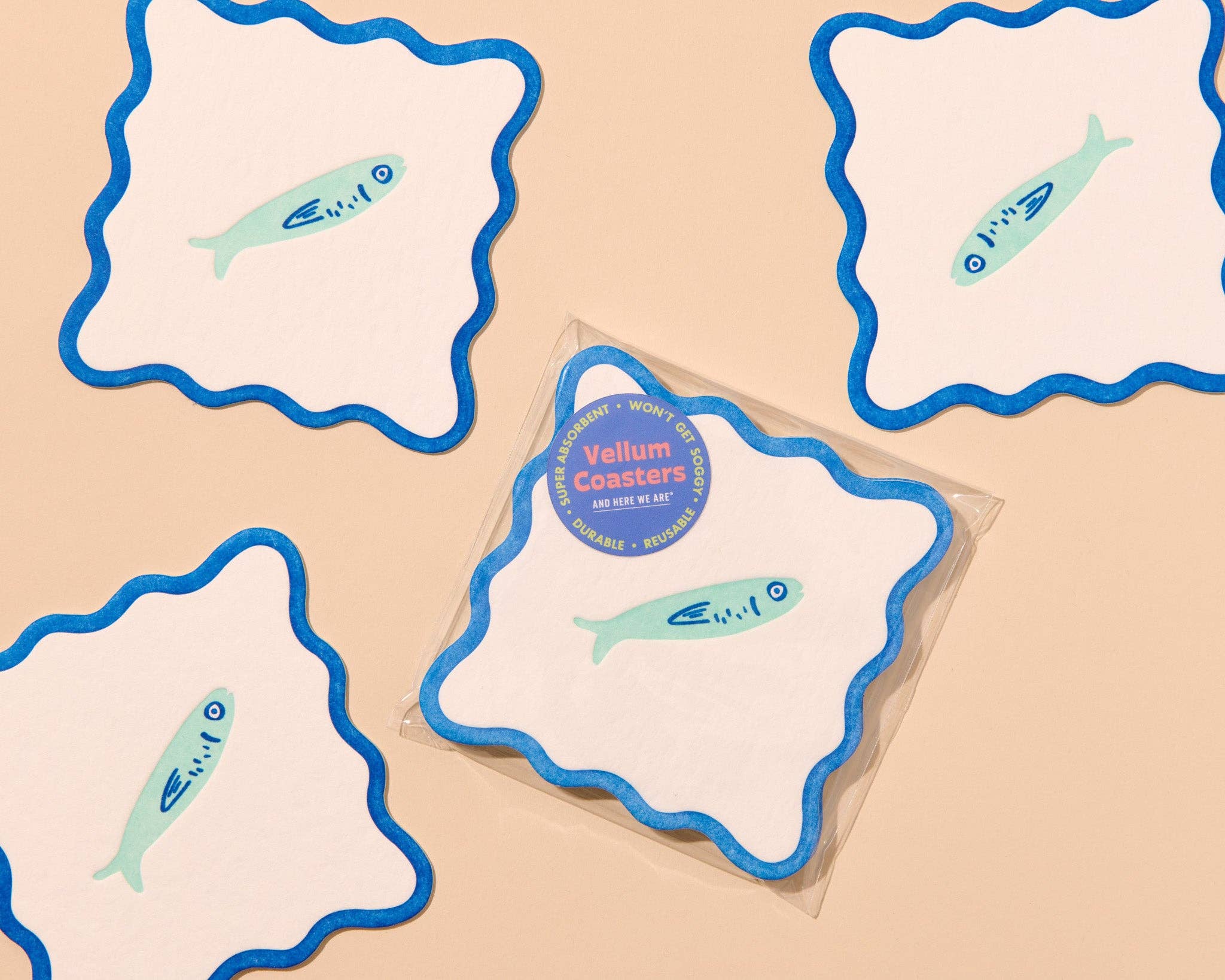A fresh sardine catch for your coffee table or bar cart! Set of 4 coasters, letterpress printed onto durable & absorbent vellum.