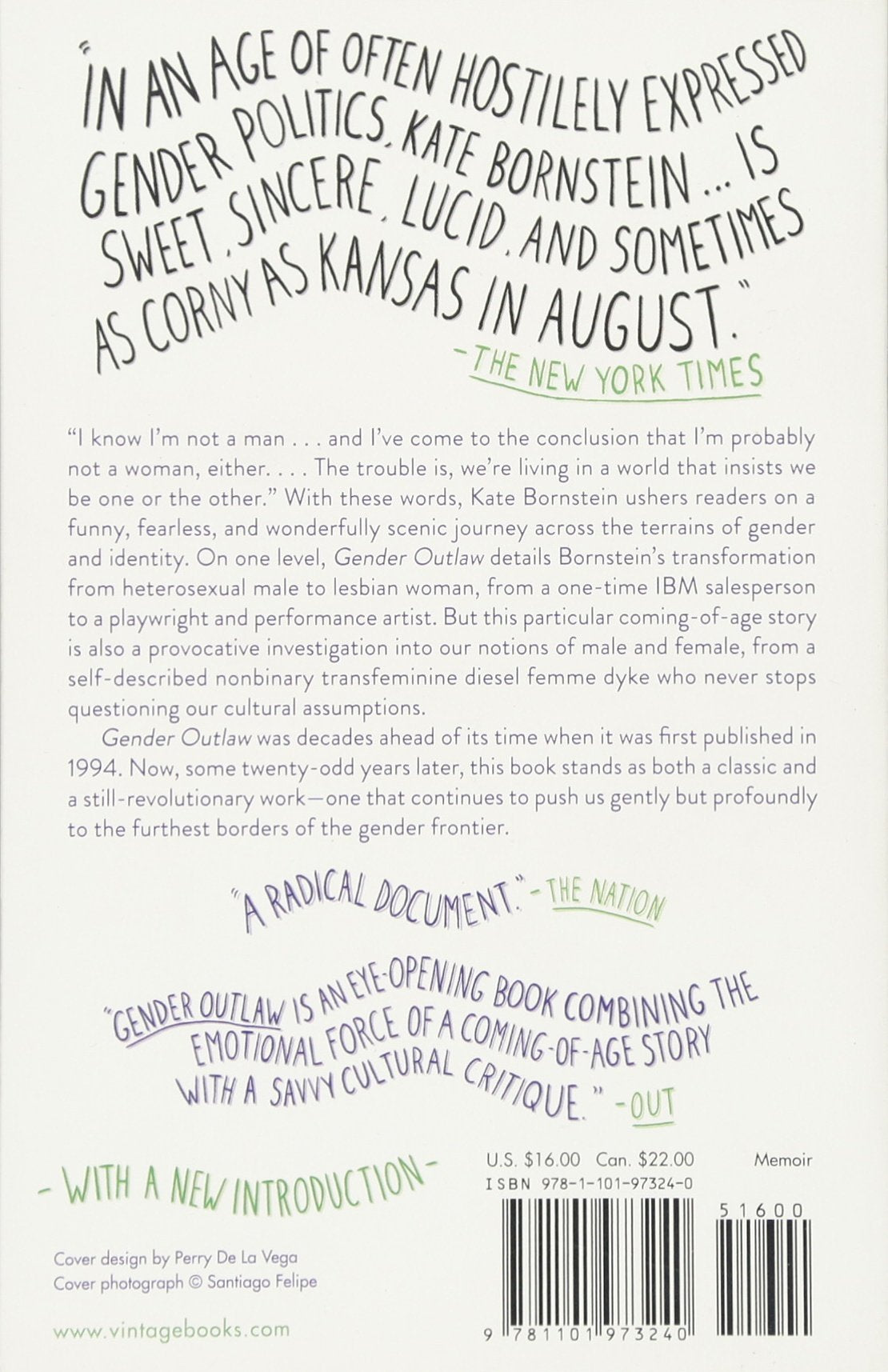 “I know I’m not a man . . . and I’ve come to the conclusion that I’m probably not a woman, either. . . . . The trouble is, we’re living in a world that insists we be one or the other.” With these words, Kate Bornstein ushers readers on a funny, fearless, and wonderfully scenic journey across the terrains of gender and identity. On one level, Gender Outlaw details Bornstein’s transformation from heterosexual male to lesbian woman, from a one-time IBM salesperson to a playwright and performance artist. But this particular coming-of-age story is also a provocative investigation into our notions of male and female, from a self-described nonbinary transfeminine diesel femme dyke who never stops questioning our cultural assumptions.
