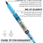 - DUAL-TIP DESIGN FOR VERSATILITY - Each pen features a 3.5mm chisel tip for bold highlights and a 0.5mm needle tip for precise writing and sketching. The bold tip’s ink won’t smudge or overshadow the fine tip’s writing. Use the fine tip for notes, quick sketches, or bullet journaling, and the bold tip to emphasize key points effortlessly. These are among the best pens for note taking and highly recommended journal pens.