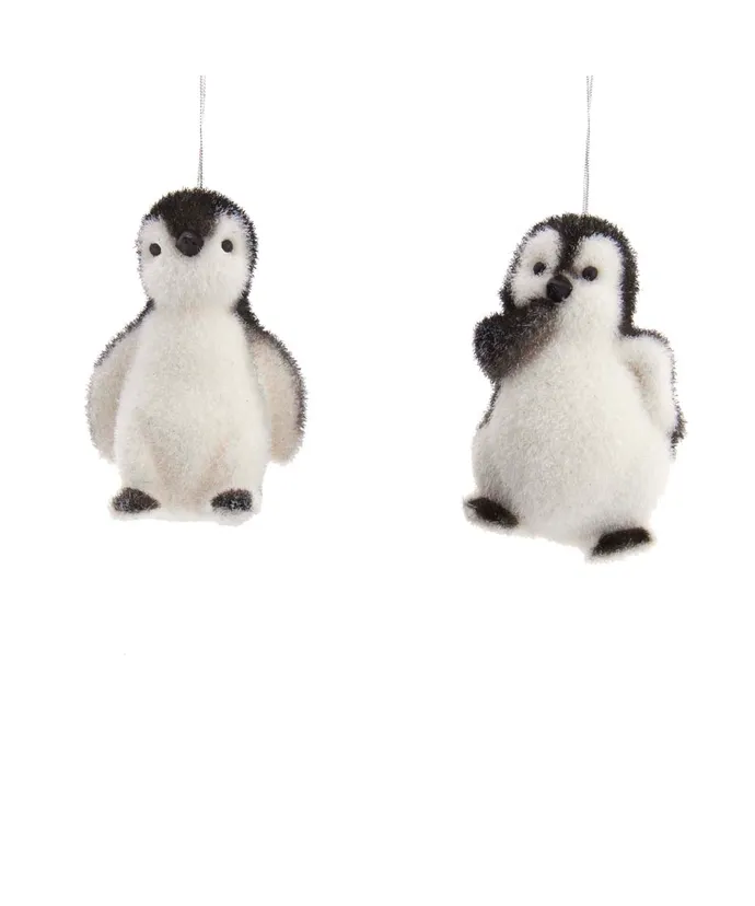 Kurt Adler's flocked penguin ornaments are a charming addition you any holiday décor or Christmas tree. This assortment features two penguin ornaments in a flocked style.
