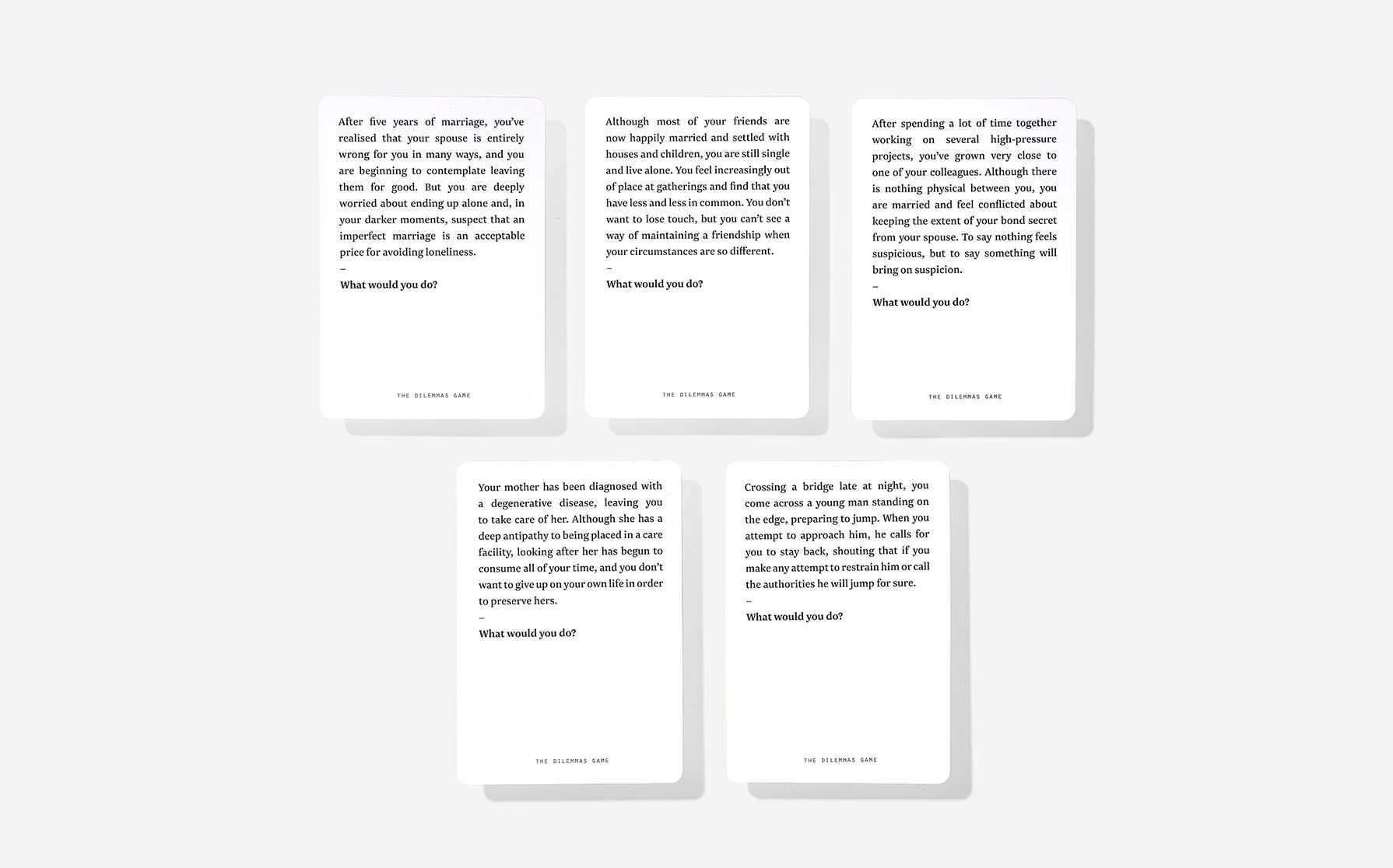 A card game that tests your ability to solve 52 everyday moral dilemmas In life, we are regularly faced with dilemmas: complex moral problems for which there are no obvious answers. When a friend confesses to having an affair, do we keep their secret? When a colleague has terrible breath, do we let them know? When a stranger is crying on the bus, do we offer comfort or keep our distance? In such moments, we long for some good advice to help us find a way forward.