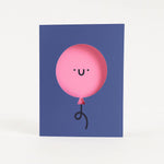This greeting card is a playful way to send your well wishes. Designed in collaboration between Rumble Cards and Ashley Le Quere, it features a cheerful pink balloon on a soothing blue background, radiating happiness.