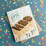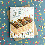 FSC-certified, recycled 110 lb. cover weight paper. Matching recycled envelope. Blank inside. The illustration continues from the front of the card to the back! Single card & envelope packaged in a clear cello sleeve. The card is A2 size (4.25" x 5.5") Professionally printed in Southern California. Epic Birthday Card - Yeppie Paper