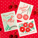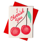 A pair of bright red cherries dangles by the message "I Cherrish You" for a simple declaration of love and friendship.