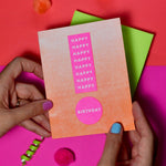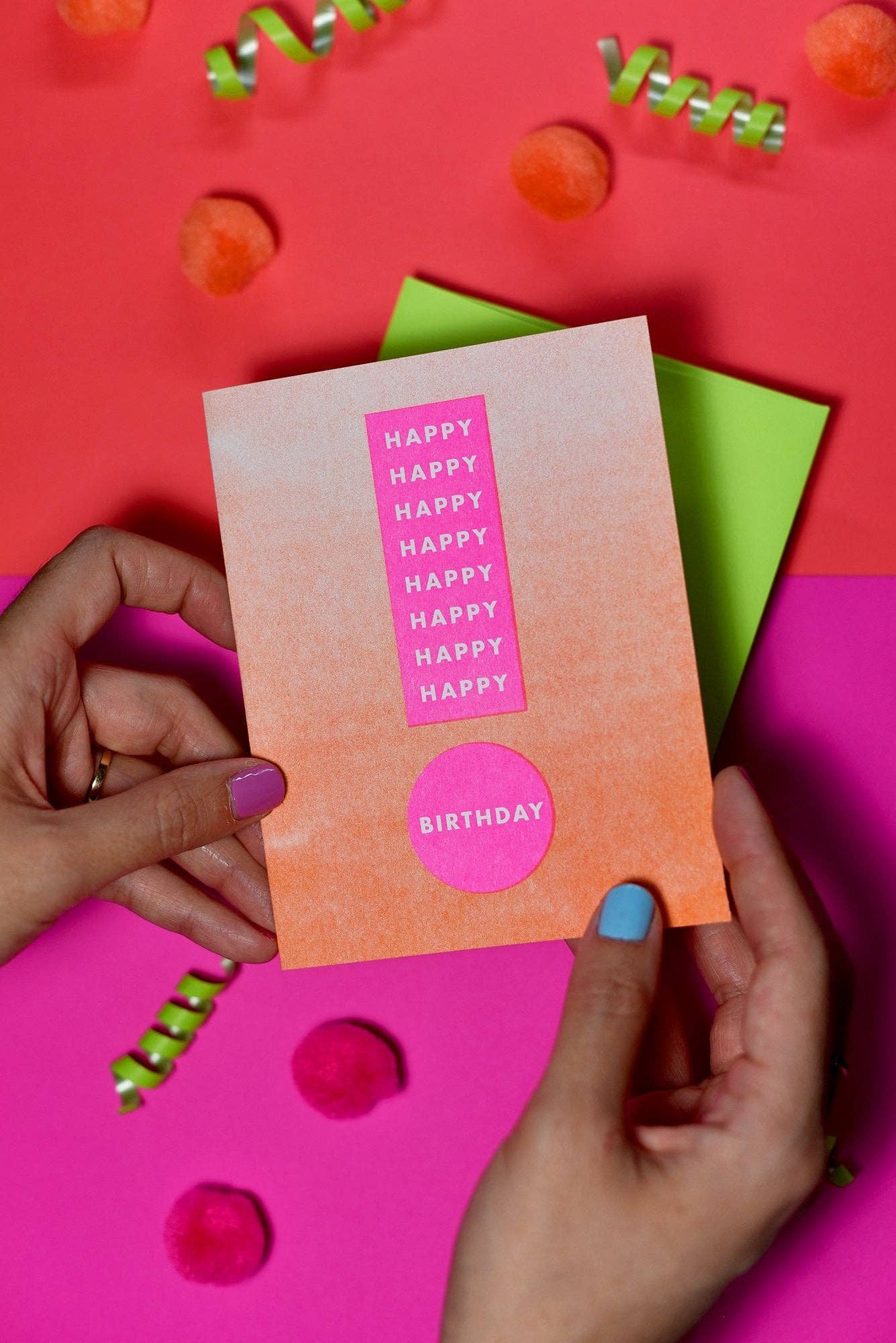 Shout "Happy Birthday" with this colorful birthday greetings card, printed on riso, featuring a giant exclamation point design.