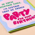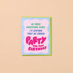 There's only one thing we can be certain about right now...it's party time. Card reads, “In these uncertain times, I'm certain that we should PARTY for your birthday”