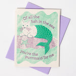 An enchanting mermaid cat suns themself on a shoal, beckoning you from across the waves with this declaration of love. Risograph printed in seafoam and plum.