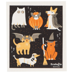 A ghostly kitty, dracu-dog, bat cat and mummy pup add costumed charm to this creepy-good reusable cleaning cloth.