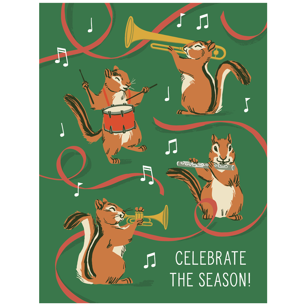 Four chipmunks are gathered together, happily making joyous music. Each wields a different instrument. The background is green and a festive red ribbon swirls about.