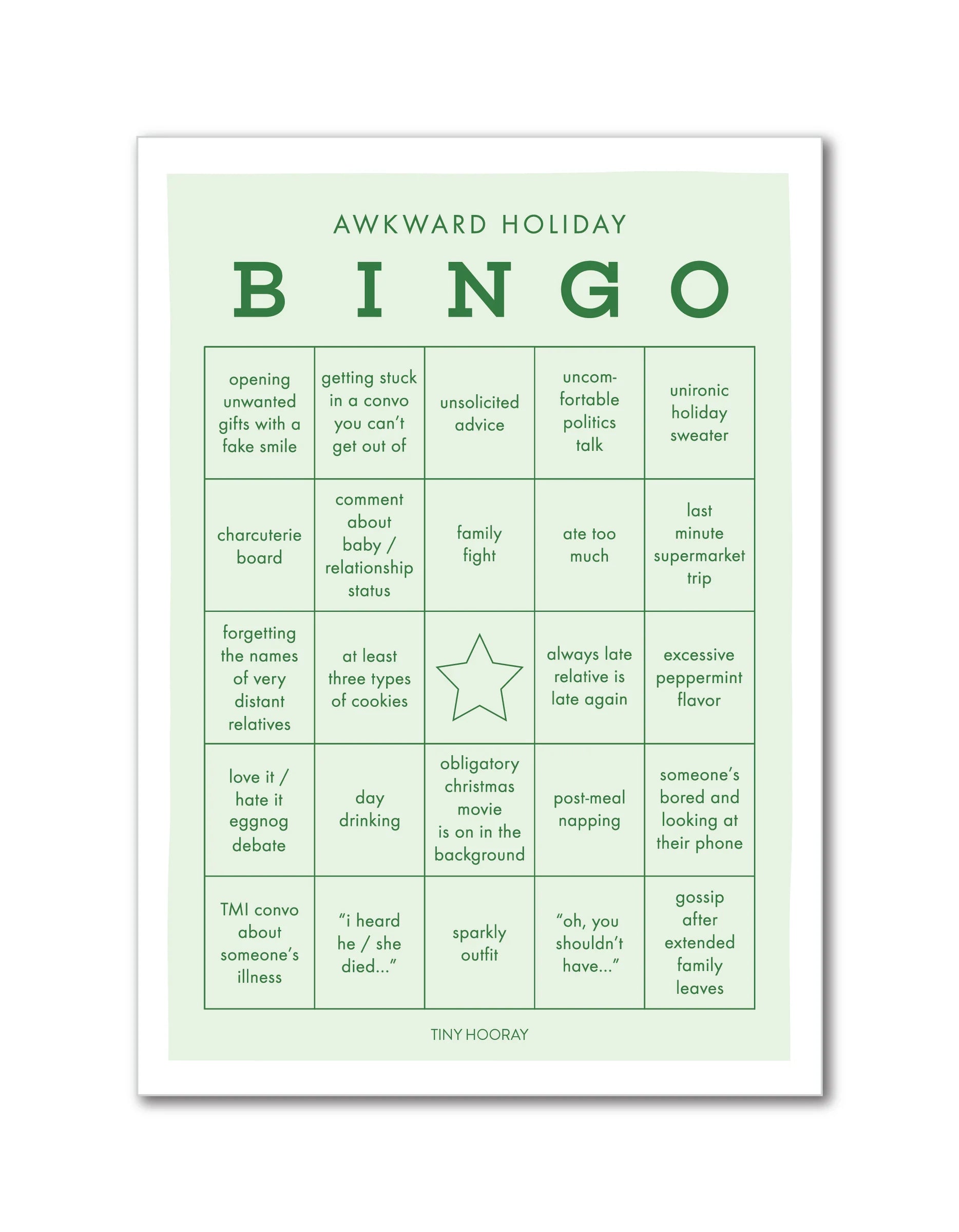 Finally, an escape from the awkwardness that comes with holiday time gatherings! Turn those many cringe-worthy moments into BINGO victory!
